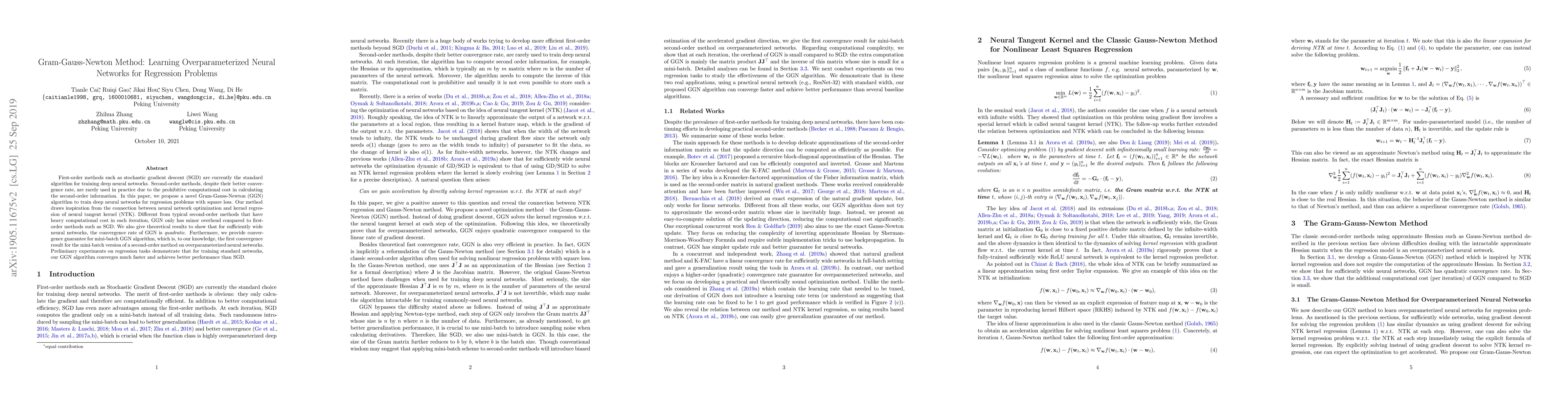 First-order methods such as stochastic gradient descent (SGD) are currently the standard algorithm for training deep neural networks. Second-order methods, despite their better convergence rate, are rarely used in practice due to the prohibitive computational cost in calculating the second-order information. In this paper, we propose a novel Gram-Gauss-Newton (GGN) algorithm to train deep neural networks for regression problems with square loss. Our method draws inspiration from the connection between neural network optimization and kernel regression of neural tangent kernel (NTK). Different from typical second-order methods that have heavy computational cost in each iteration, GGN only has minor overhead compared to first-order methods such as SGD. We also give theoretical results to show that for sufficiently wide neural networks, the convergence rate of GGN is \emph{quadratic}. Furthermore, we provide convergence guarantee for mini-batch GGN algorithm, which is, to our knowledge, the first convergence result for the mini-batch version of a second-order method on overparameterized neural networks. Preliminary experiments on regression tasks demonstrate that for training standard networks, our GGN algorithm converges much faster and achieves better performance than SGD.