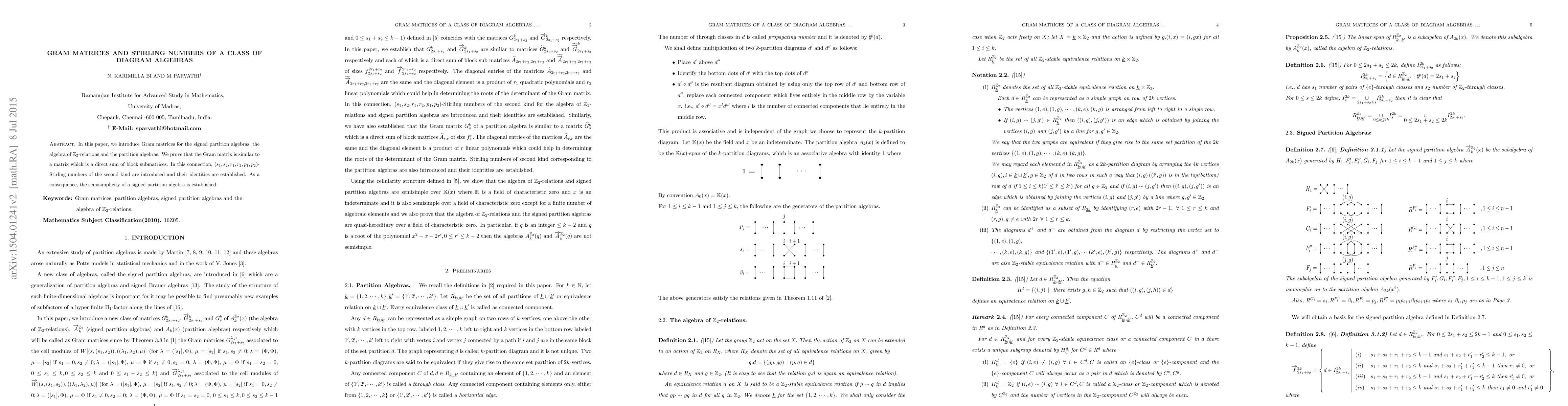 In this paper, we introduce Gram matrices for the signed partition algebras, the algebra of $\mathbb{Z}_2$-relations and the partition algebras. We prove that the Gram matrix is similar to a matrix which is a direct sum of block submatrices. In this connection, $(s_1, s_2, r_1, r_2, p_1, p_2)$-Stirling numbers of the second kind are introduced and their identities are established. As a consequence, the semisimplicity of a signed partition algebra is established.