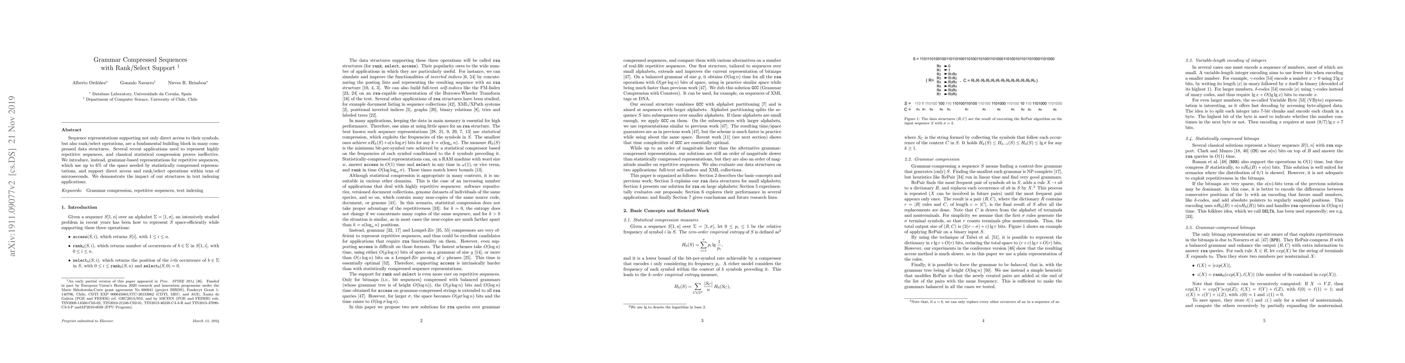 This paper introduces grammar-compressed sequences that efficiently represent highly repetitive sequences, using up to 6% of the space needed by statistical compression methods, while supporting rank/select operations and direct symbol access in microseconds. The effectiveness of these structures is demonstrated in text indexing applications.