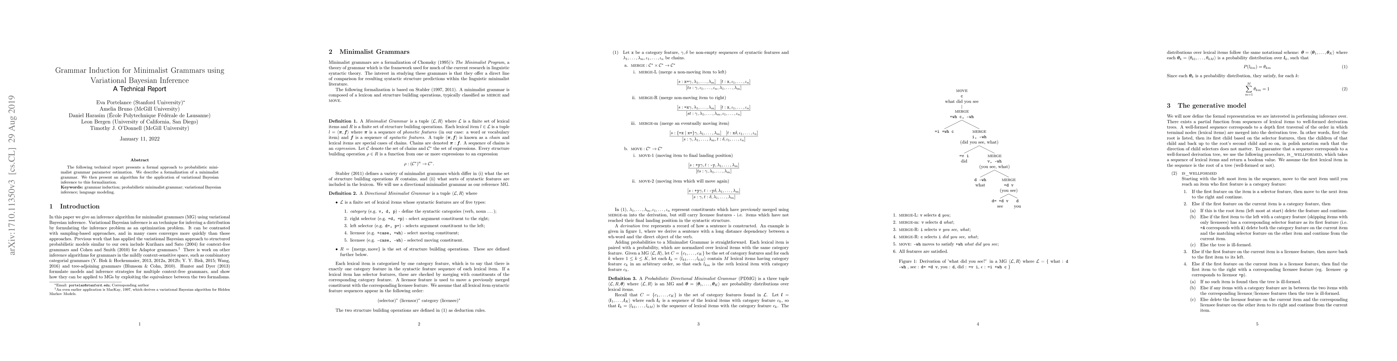 The following technical report presents a formal approach to probabilistic minimalist grammar parameter estimation. We describe a formalization of a minimalist grammar. We then present an algorithm for the application of variational Bayesian inference to this formalization.