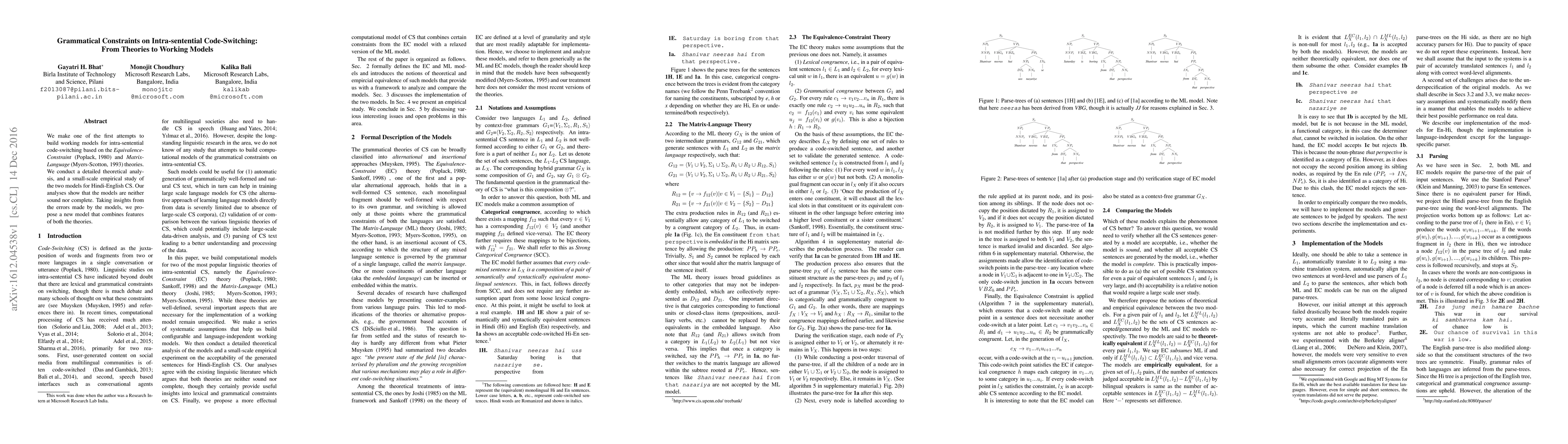 We make one of the first attempts to build working models for intra-sentential code-switching based on the Equivalence-Constraint (Poplack 1980) and Matrix-Language (Myers-Scotton 1993) theories. We conduct a detailed theoretical analysis, and a small-scale empirical study of the two models for Hindi-English CS. Our analyses show that the models are neither sound nor complete. Taking insights from the errors made by the models, we propose a new model that combines features of both the theories.