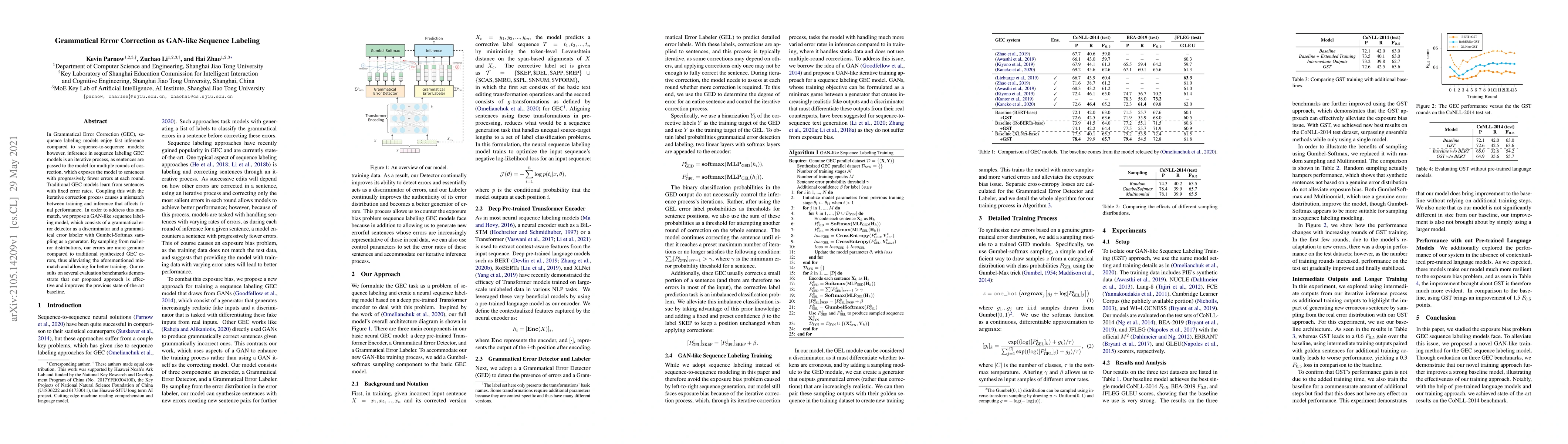 This paper proposes a GAN-like sequence labeling model for Grammatical Error Correction (GEC) that uses a discriminator and a generator with Gumbel-Softmax sampling to better simulate real error distributions, addressing the mismatch between training and iterative correction processes. The results show improved performance over previous state-of-the-art baselines.