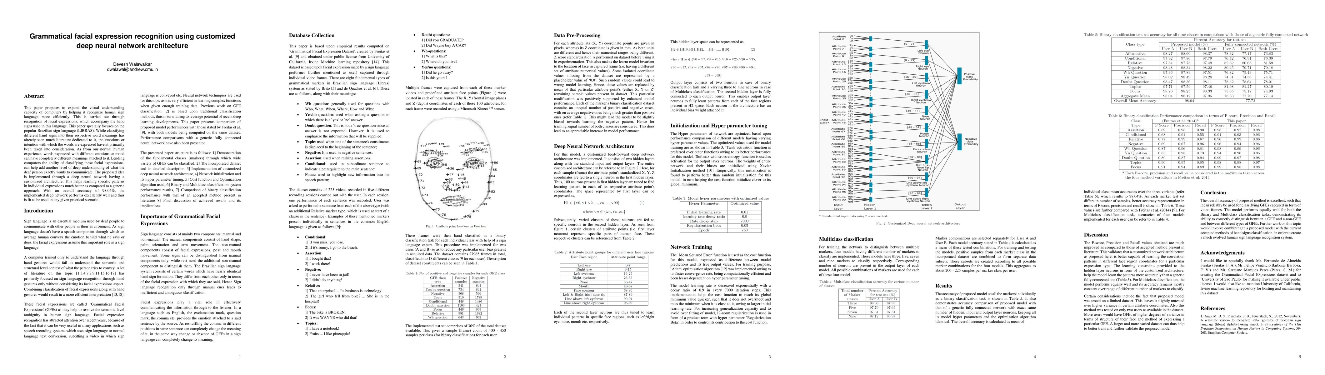 This paper proposes to expand the visual understanding capacity of computers by helping it recognize human sign language more efficiently. This is carried out through recognition of facial expressions, which accompany the hand signs used in this language. This paper specially focuses on the popular Brazilian sign language (LIBRAS). While classifying different hand signs into their respective word meanings has already seen much literature dedicated to it, the emotions or intention with which the words are expressed haven't primarily been taken into consideration. As from our normal human experience, words expressed with different emotions or mood can have completely different meanings attached to it. Lending computers the ability of classifying these facial expressions, can help add another level of deep understanding of what the deaf person exactly wants to communicate. The proposed idea is implemented through a deep neural network having a customized architecture. This helps learning specific patterns in individual expressions much better as compared to a generic approach. With an overall accuracy of 98.04%, the implemented deep network performs excellently well and thus is fit to be used in any given practical scenario.