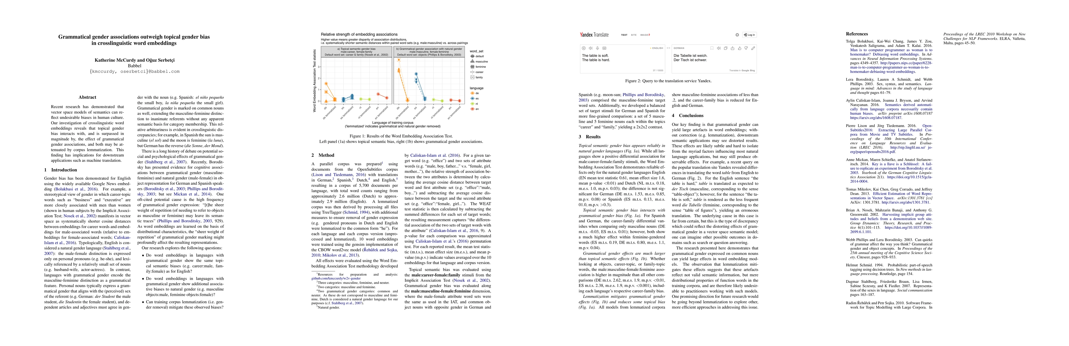 Recent research has demonstrated that vector space models of semantics can reflect undesirable biases in human culture. Our investigation of crosslinguistic word embeddings reveals that topical gender bias interacts with, and is surpassed in magnitude by, the effect of grammatical gender associations, and both may be attenuated by corpus lemmatization. This finding has implications for downstream applications such as machine translation.