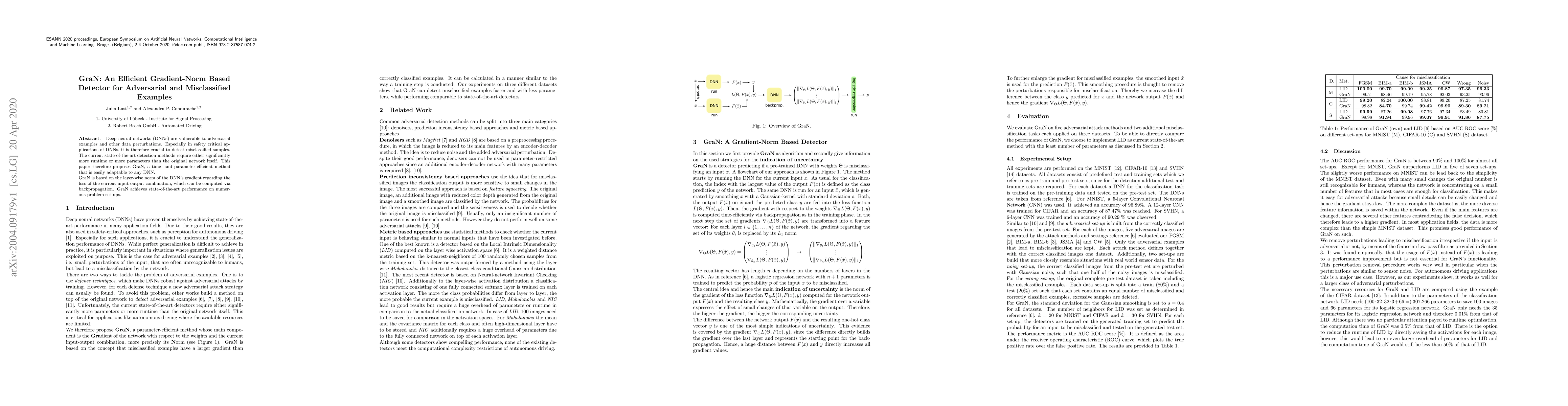 GraN introduces a novel, parameter-efficient method for detecting adversarial and misclassified examples by leveraging the layer-wise norm of gradients.