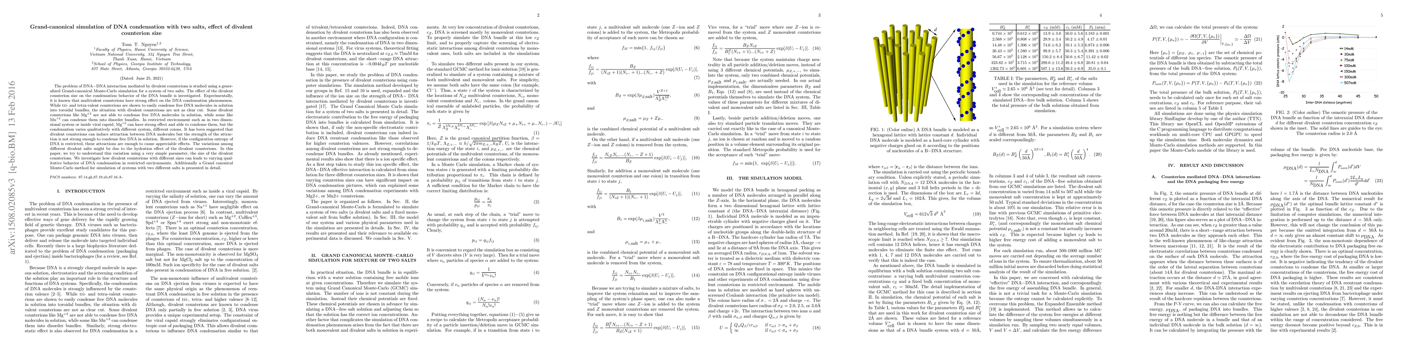 The problem of DNA$-$DNA interaction mediated by divalent counterions is studied using a generalized Grand-canonical Monte-Carlo simulation for a system of two salts. The effect of the divalent counterion size on the condensation behavior of the DNA bundle is investigated. Experimentally, it is known that multivalent counterions have strong effect on the DNA condensation phenomenon. While tri- and tetra-valent counterions are shown to easily condense free DNA molecules in solution into toroidal bundles, the situation with divalent counterions are not as clear cut. Some divalent counterions like Mg$^{+2}$ are not able to condense free DNA molecules in solution, while some like Mn$^{+2}$ can condense them into disorder bundles. In restricted environment such as in two dimensional system or inside viral capsid, Mg$^{+2}$ can have strong effect and able to condense them, but the condensation varies qualitatively with different system, different coions. It has been suggested that divalent counterions can induce attraction between DNA molecules but the strength of the attraction is not strong enough to condense free DNA in solution. However, if the configuration entropy of DNA is restricted, these attractions are enough to cause appreciable effects. The variations among different divalent salts might be due to the hydration effect of the divalent counterions. In this paper, we try to understand this variation using a very simple parameter, the size of the divalent counterions. We investigate how divalent counterions with different sizes can leads to varying qualitative behavior of DNA condensation in restricted environments. Additionally a Grand canonical Monte-Carlo method for simulation of systems with two different salts is presented in detail.