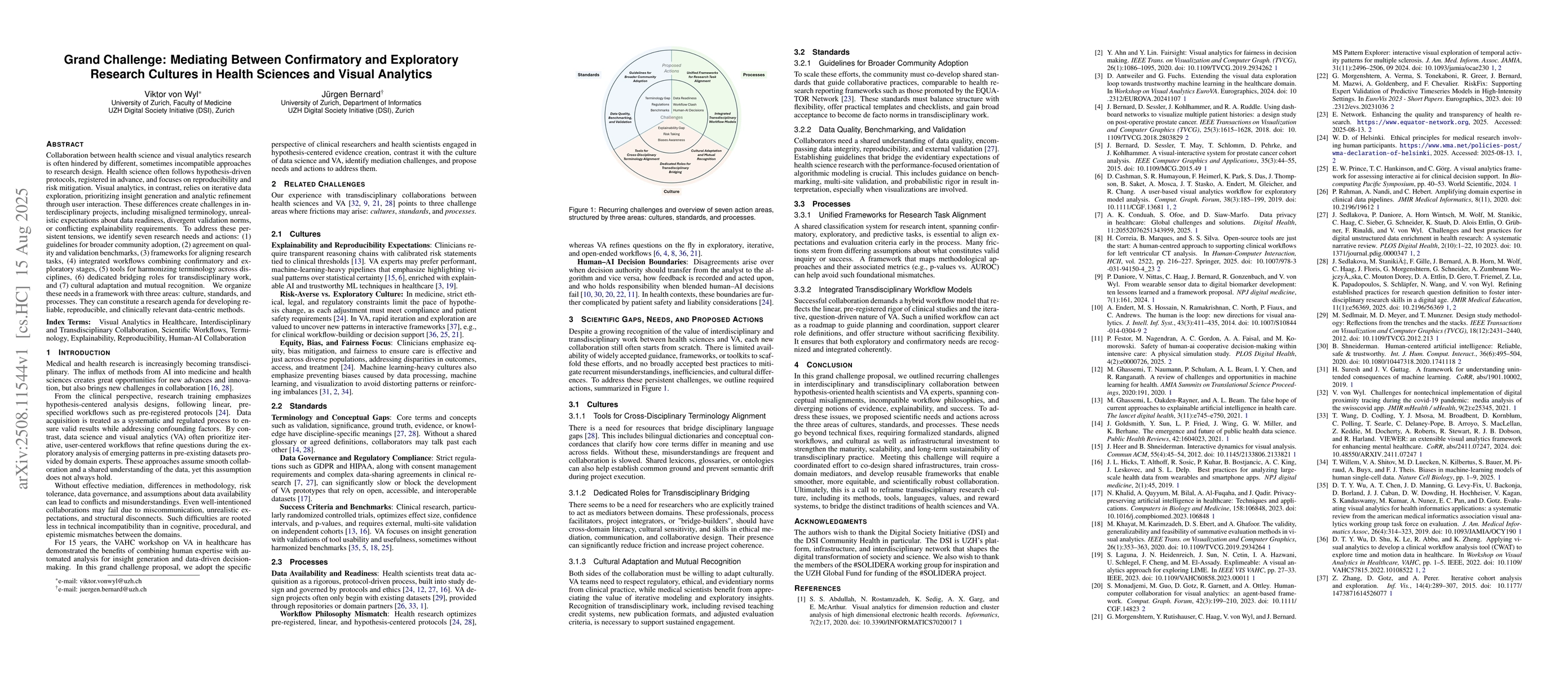Collaboration between health science and visual analytics research is often hindered by different, sometimes incompatible approaches to research design. Health science often follows hypothesis-driven protocols, registered in advance, and focuses on reproducibility and risk mitigation. Visual analytics, in contrast, relies on iterative data exploration, prioritizing insight generation and analytic refinement through user interaction. These differences create challenges in interdisciplinary projects, including misaligned terminology, unrealistic expectations about data readiness, divergent validation norms, or conflicting explainability requirements. To address these persistent tensions, we identify seven research needs and actions: (1) guidelines for broader community adoption, (2) agreement on quality and validation benchmarks, (3) frameworks for aligning research tasks, (4) integrated workflows combining confirmatory and exploratory stages, (5) tools for harmonizing terminology across disciplines, (6) dedicated bridging roles for transdisciplinary work, and (7) cultural adaptation and mutual recognition. We organize these needs in a framework with three areas: culture, standards, and processes. They can constitute a research agenda for developing reliable, reproducible, and clinically relevant data-centric methods.