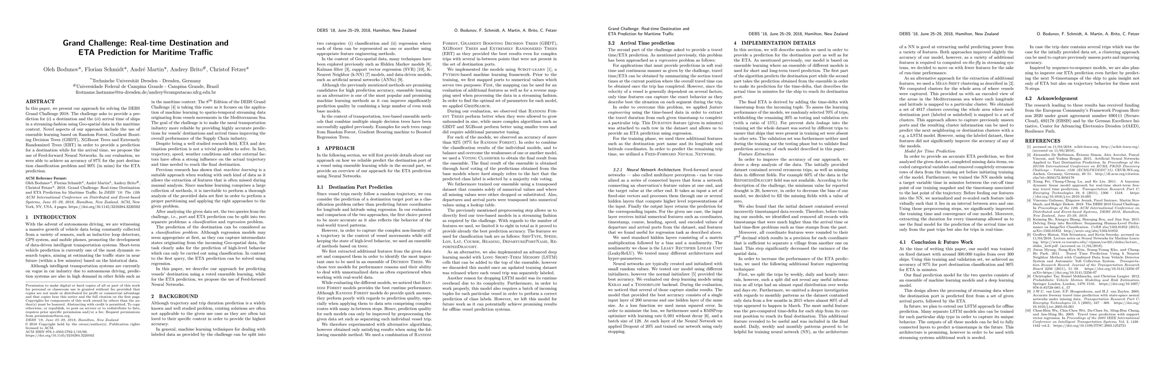 In this paper, we present our approach for solving the DEBS Grand Challenge 2018. The challenge asks to provide a prediction for (i) a destination and the (ii) arrival time of ships in a streaming-fashion using Geo-spatial data in the maritime context. Novel aspects of our approach include the use of ensemble learning based on Random Forest, Gradient Boosting Decision Trees (GBDT), XGBoost Trees and Extremely Randomized Trees (ERT) in order to provide a prediction for a destination while for the arrival time, we propose the use of Feed-forward Neural Networks. In our evaluation, we were able to achieve an accuracy of 97% for the port destination classification problem and 90% (in mins) for the ETA prediction.