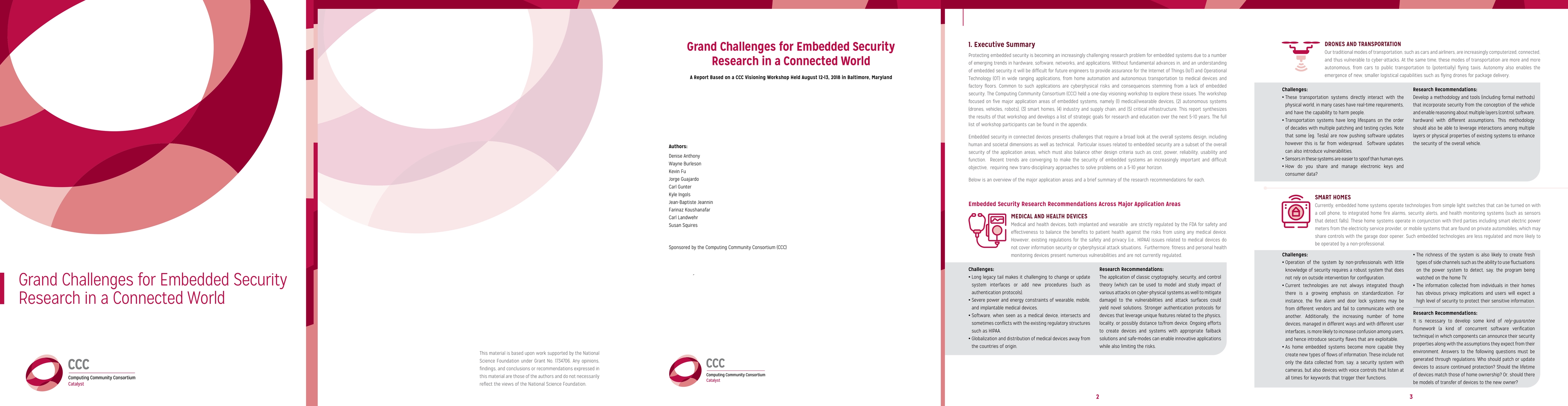This paper outlines the grand challenges for embedded security research in connected systems, emphasizing the need for fundamental advances to secure Internet of Things (IoT) and Operational Technology (OT) applications. The Computing Community Consortium workshop identified five key application areas and proposed strategic goals for research and education over the next 5-10 years to address these challenges.