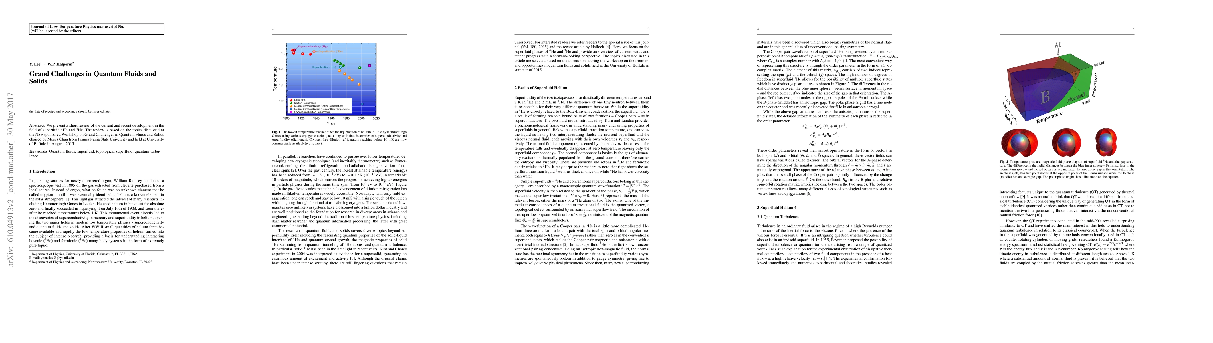 We present a short review of the current and recent development in the field of superfluid 3He and 4He. The review is based on the topics discussed at the NSF sponsoredWorkshop on Grand Challenges in Quantum Fluids and Solids chaired by Moses Chan from Pennsylvania State University and held at University of Buffalo in August, 2015.