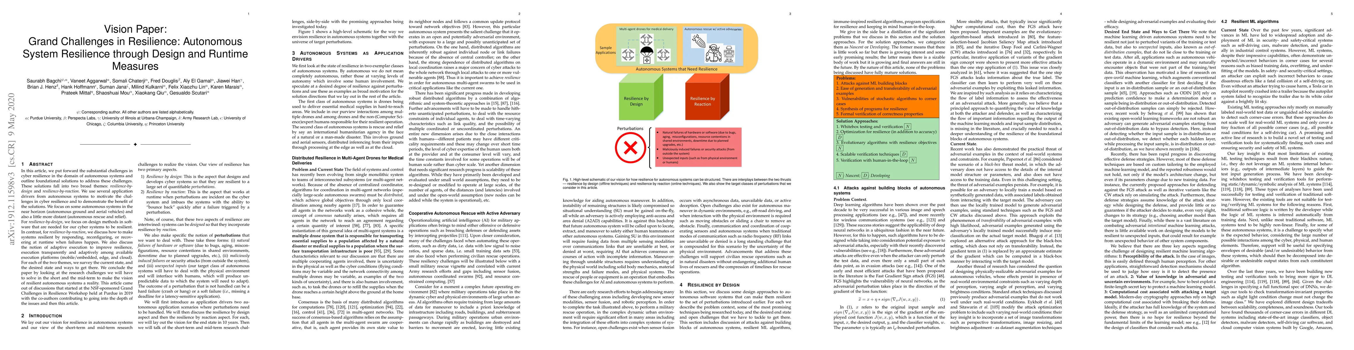 A set of about 80 researchers, practitioners, and federal agency program managers participated in the NSF-sponsored Grand Challenges in Resilience Workshop held on Purdue campus on March 19-21, 2019. The workshop was divided into three themes: resilience in cyber, cyber-physical, and socio-technical systems. About 30 attendees in all participated in the discussions of cyber resilience. This article brings out the substantive parts of the challenges and solution approaches that were identified in the cyber resilience theme. In this article, we put forward the substantial challenges in cyber resilience in a few representative application domains and outline foundational solutions to address these challenges. These solutions fall into two broad themes: resilience-by-design and resilience-by-reaction. We use examples of autonomous systems as the application drivers motivating cyber resilience. We focus on some autonomous systems in the near horizon (autonomous ground and aerial vehicles) and also a little more distant (autonomous rescue and relief). For resilience-by-design, we focus on design methods in software that are needed for our cyber systems to be resilient. In contrast, for resilience-by-reaction, we discuss how to make systems resilient by responding, reconfiguring, or recovering at runtime when failures happen. We also discuss the notion of adaptive execution to improve resilience, execution transparently and adaptively among available execution platforms (mobile/embedded, edge, and cloud). For each of the two themes, we survey the current state, and the desired state and ways to get there. We conclude the paper by looking at the research challenges we will have to solve in the short and the mid-term to make the vision of resilient autonomous systems a reality.