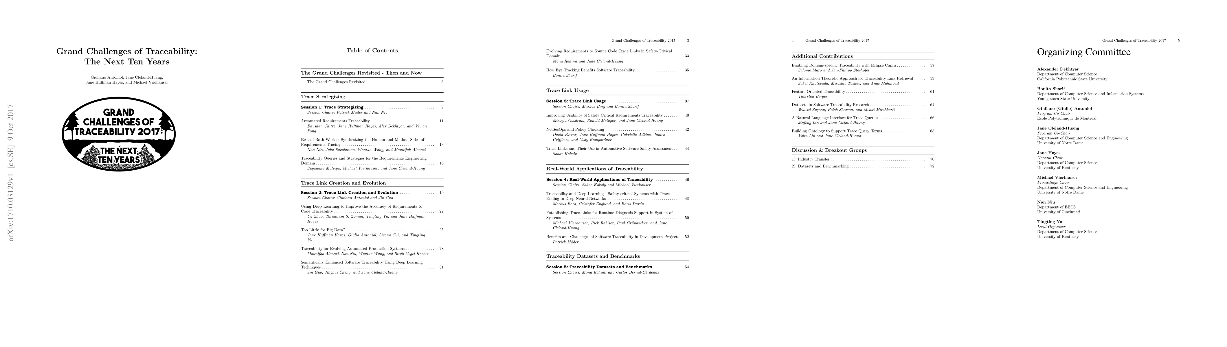 In 2007, the software and systems traceability community met at the first Natural Bridge symposium on the Grand Challenges of Traceability to establish and address research goals for achieving effective, trustworthy, and ubiquitous traceability. Ten years later, in 2017, the community came together to evaluate a decade of progress towards achieving these goals. These proceedings document some of that progress. They include a series of short position papers, representing current work in the community organized across four process axes of traceability practice. The sessions covered topics from Trace Strategizing, Trace Link Creation and Evolution, Trace Link Usage, real-world applications of Traceability, and Traceability Datasets and benchmarks. Two breakout groups focused on the importance of creating and sharing traceability datasets within the research community, and discussed challenges related to the adoption of tracing techniques in industrial practice. Members of the research community are engaged in many active, ongoing, and impactful research projects. Our hope is that ten years from now we will be able to look back at a productive decade of research and claim that we have achieved the overarching Grand Challenge of Traceability, which seeks for traceability to be always present, built into the engineering process, and for it to have "effectively disappeared without a trace". We hope that others will see the potential that traceability has for empowering software and systems engineers to develop higher-quality products at increasing levels of complexity and scale, and that they will join the active community of Software and Systems traceability researchers as we move forward into the next decade of research.