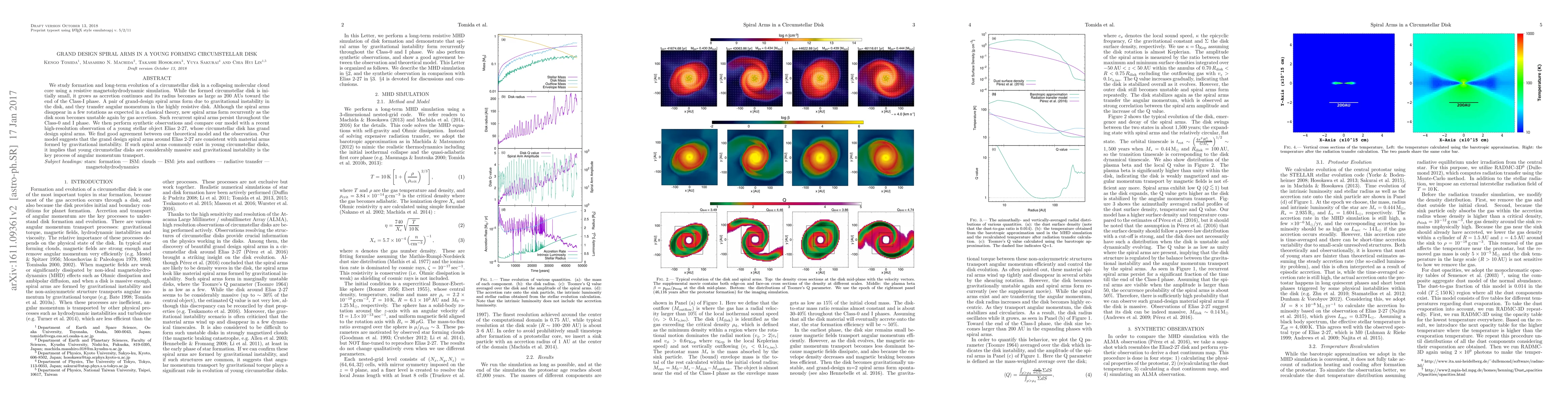 This paper investigates the formation and evolution of a circumstellar disk in a collapsing molecular cloud, finding that grand-design spiral arms emerge due to gravitational instability and recur as the disk accretes gas. The model aligns well with observations of the young stellar object Elias 2-27, suggesting that such spiral arms indicate massive disks and gravitational instability as a key angular momentum transport mechanism.