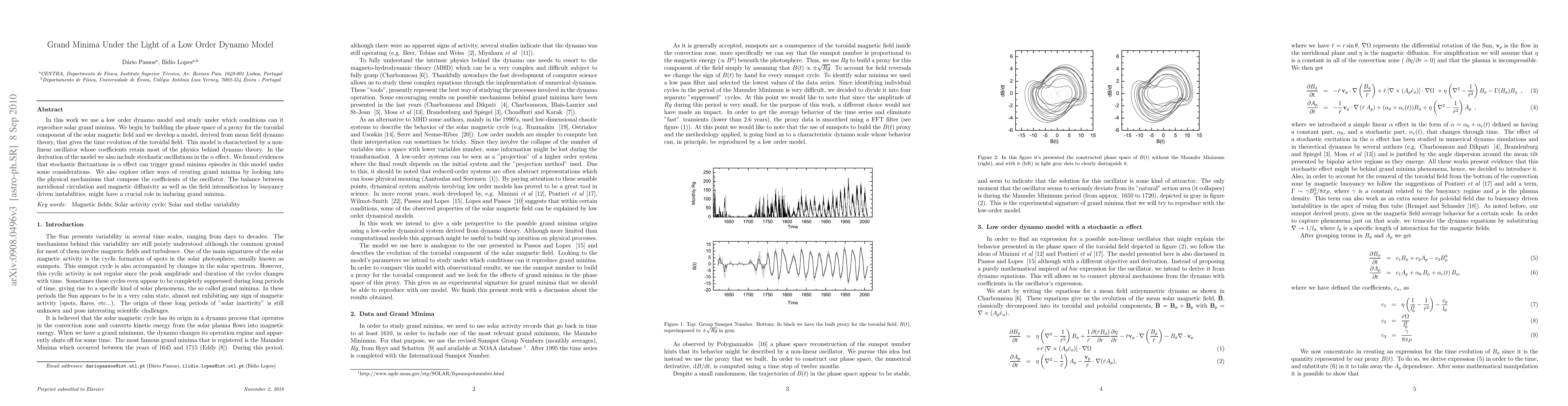A study using a low-order dynamo model found that grand minima episodes in solar activity may be triggered by meridional circulation, magnetic diffusivity, or buoyancy-driven instabilities, rather than stochastic fluctuations.
