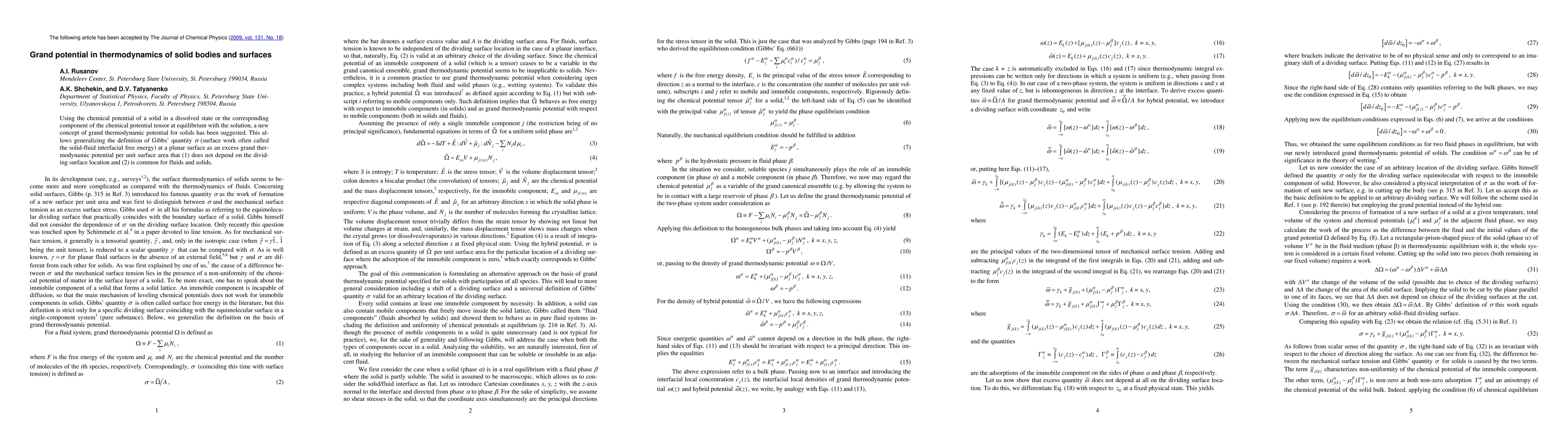 Using the chemical potential of a solid in a dissolved state or the corresponding component of the chemical potential tensor at equilibrium with the solution, a new concept of grand thermodynamic potential for solids has been suggested. This allows generalizing the definition of Gibbs' quantity $\sigma$ (surface work often called the solid-fluid interfacial free energy) at a planar surface as an excess grand thermodynamic potential per unit surface area that (1) does not depend on the dividing surface location and (2) is common for fluids and solids.
