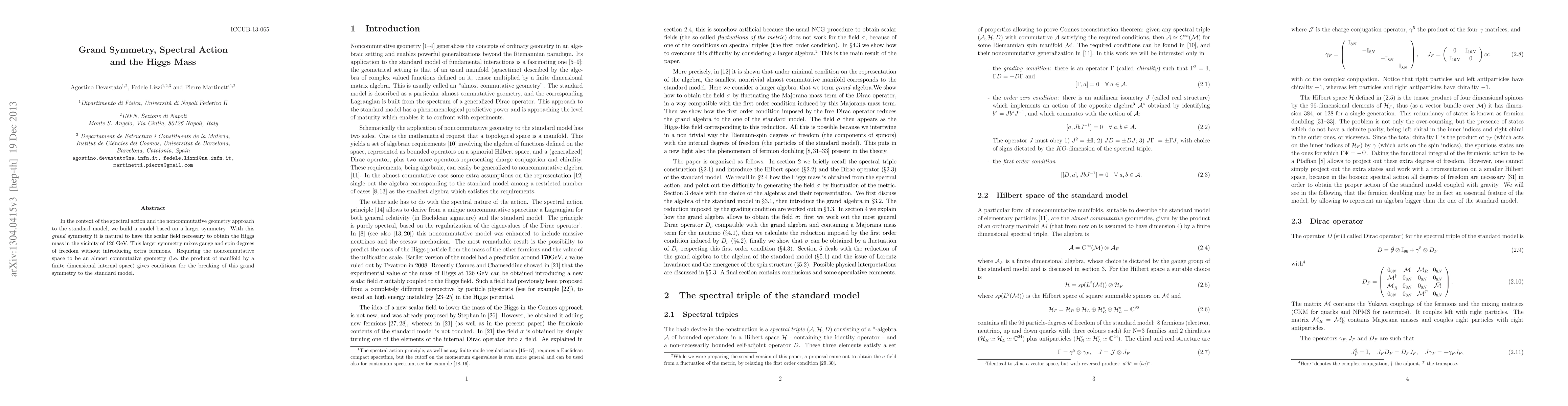 In the context of the spectral action and the noncommutative geometry approach to the standard model, we build a model based on a larger symmetry. With this "grand symmetry" it is natural to have the scalar field necessary to obtain the Higgs mass in the vicinity of 126 GeV. This larger symmetry mixes gauge and spin degrees of freedom without introducing extra fermions. Requiring the noncommutative space to be an almost commutative geometry (i.e. the product of manifold by a finite dimensional internal space) gives conditions for the breaking of this grand symmetry to the standard model.