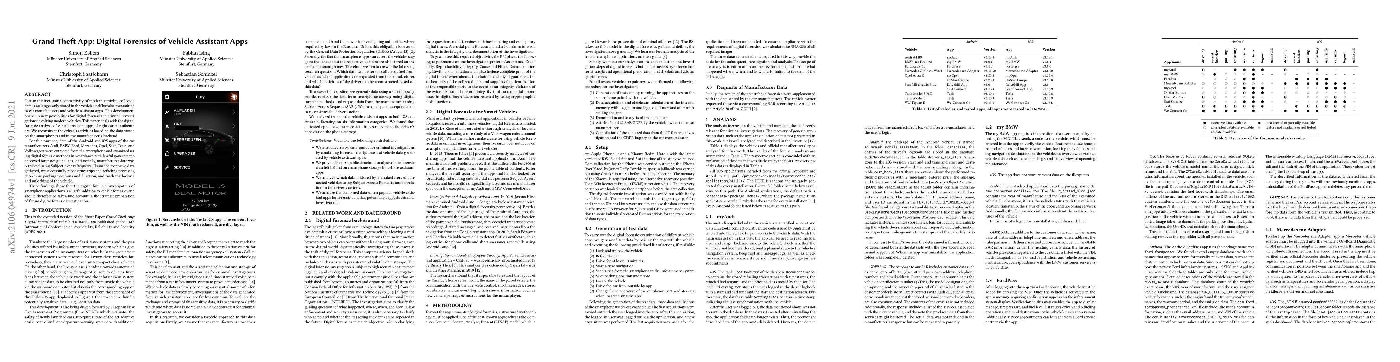 Due to the increasing connectivity of modern vehicles, collected data is no longer only stored in the vehicle itself but also transmitted to car manufacturers and vehicle assistant apps. This development opens up new possibilities for digital forensics in criminal investigations involving modern vehicles. This paper deals with the digital forensic analysis of vehicle assistant apps of eight car manufacturers. We reconstruct the driver's activities based on the data stored on the smartphones and in the manufacturer's backend. For this purpose, data of the Android and iOS apps of the car manufacturers Audi, BMW, Ford, Mercedes, Opel, Seat, Tesla, and Volkswagen were extracted from the smartphone and examined using digital forensic methods in accordance with lawful government-approved forensics guidelines. Additionally, manufacturer data was retrieved using Subject Access Requests. Using the extensive data gathered, we successfully reconstruct trips and refueling processes, determine parking positions and duration, and track the locking and unlocking of the vehicle. These findings show that the digital forensic investigation of smartphone applications is a useful addition to vehicle forensics and should therefore be taken into account in the strategic preparation of future digital forensic investigations.