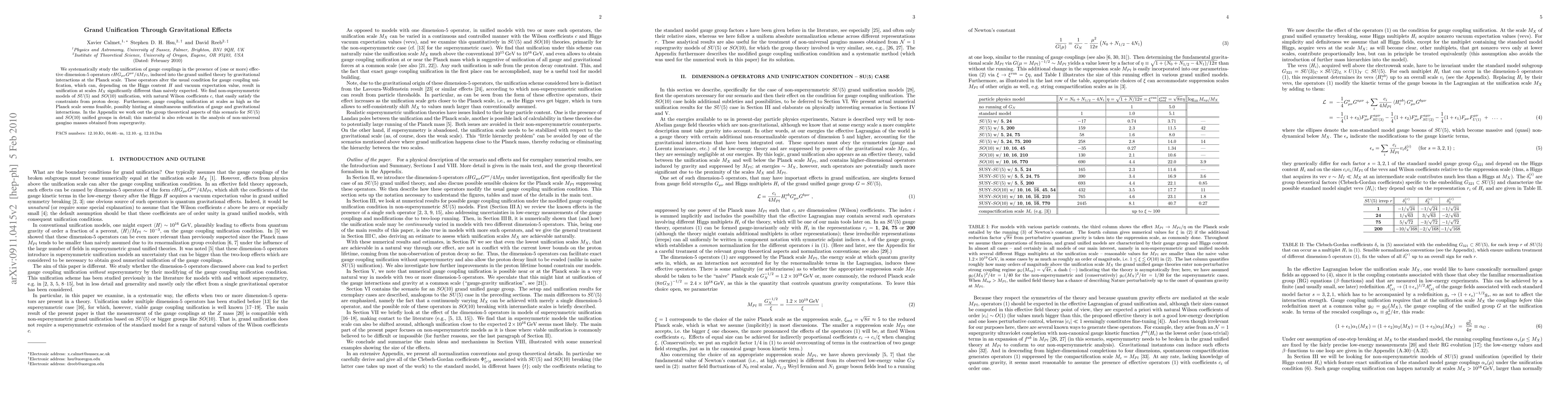 This paper explores the unification of gauge couplings in grand unified theories (GUTs) influenced by effective dimension-5 operators, suggesting that gravitational interactions at the Planck scale can lead to unification at scales MX distinct from the conventional expectations. The study finds non-supersymmetric models of SU(5) and SO(10) GUTs that satisfy proton decay constraints and hint at the possibility of unifying gauge and gravitational interactions at the Planck scale.