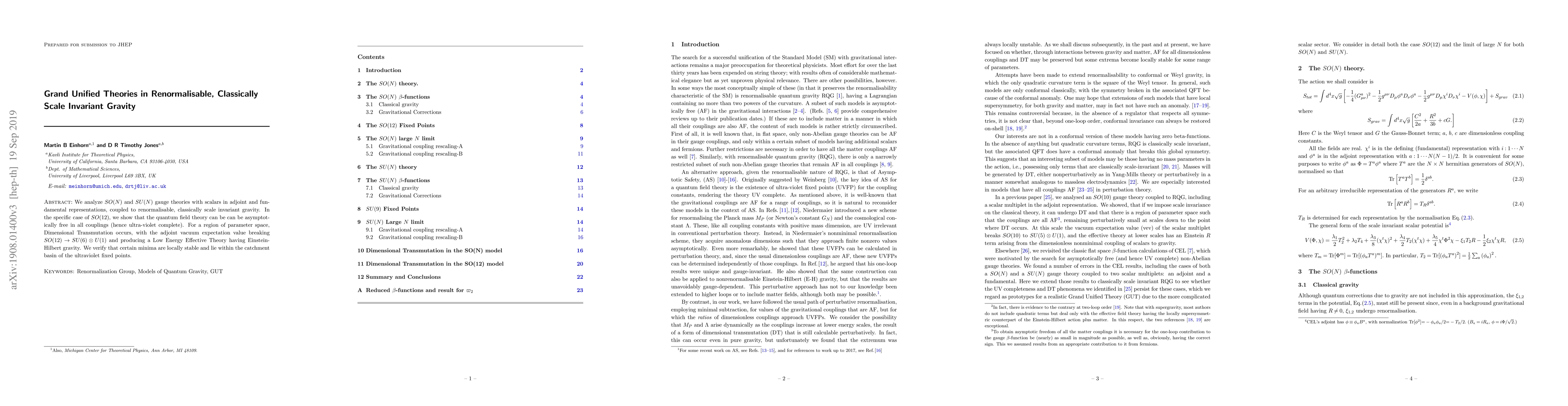 We analyze $SO(N)$ and $SU(N)$ gauge theories with scalars in adjoint and fundamental representations, coupled to renormalisable, classically scale invariant gravity. In the specific case of $SO(12),$ we show that the quantum field theory can be can be asymptotically free in all couplings (hence ultra-violet complete). For a region of parameter space, Dimensional Transmutation occurs, with the adjoint vacuum expectation value breaking $SO(12) \to SU(6)\otimes U(1)$ and producing a Low Energy Effective Theory having Einstein-Hilbert gravity. We verify that certain minima are locally stable and lie within the catchment basin of the ultraviolet fixed points.