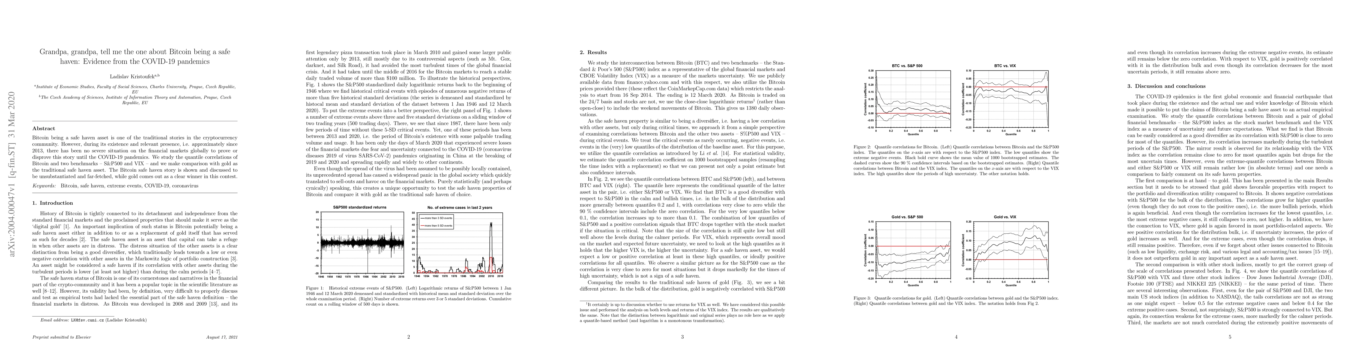 Bitcoin being a safe haven asset is one of the traditional stories in the cryptocurrency community. However, during its existence and relevant presence, i.e. approximately since 2013, there has been no severe situation on the financial markets globally to prove or disprove this story until the COVID-19 pandemics. We study the quantile correlations of Bitcoin and two benchmarks -- S\&P500 and VIX -- and we make comparison with gold as the traditional safe haven asset. The Bitcoin safe haven story is shown and discussed to be unsubstantiated and far-fetched, while gold comes out as a clear winner in this contest.