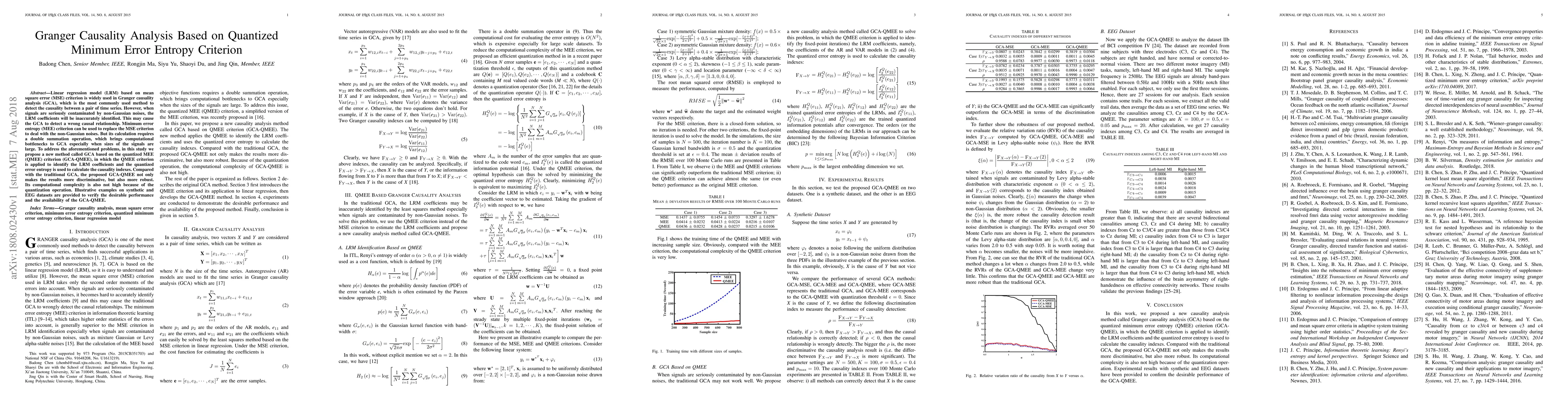 This paper proposes a new Granger causality analysis method called GCA based on Quantized Minimum Error Entropy (GCA-QMEE) to improve the accuracy and robustness of detecting causal relationships in time series data, especially when contaminated by non-Gaussian noise. The method uses quantized MEE to reduce computational complexity while maintaining discriminative and robust results.