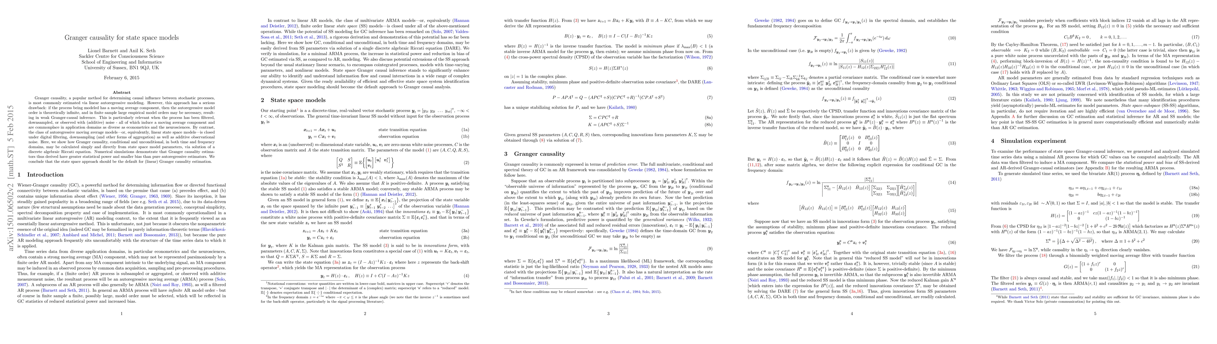 The paper demonstrates that Granger causality for state space models, both conditional and unconditional, in time and frequency domains, can be simply expressed in terms of state space model parameters, calculated by solving a single discrete algebraic Riccati equation.