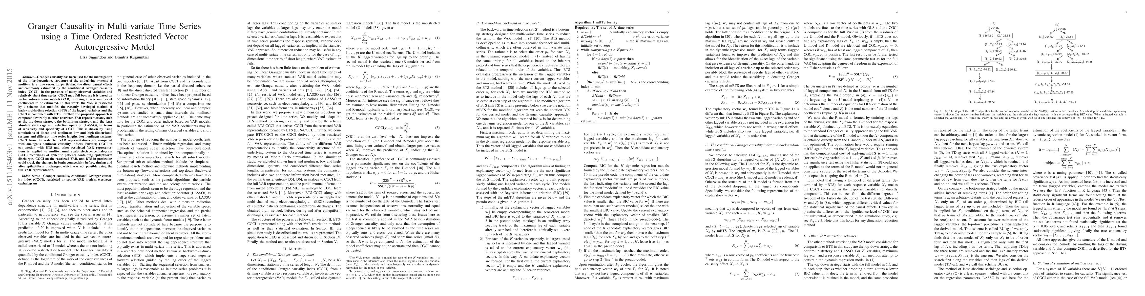 This paper proposes a restricted vector autoregressive (VAR) model combined with backward-in-time selection (BTS) to enhance the Granger causality index (CGCI) for multi-variate time series analysis. The method is shown to outperform other restricted VAR approaches in sensitivity and specificity, particularly in complex, short time series data.