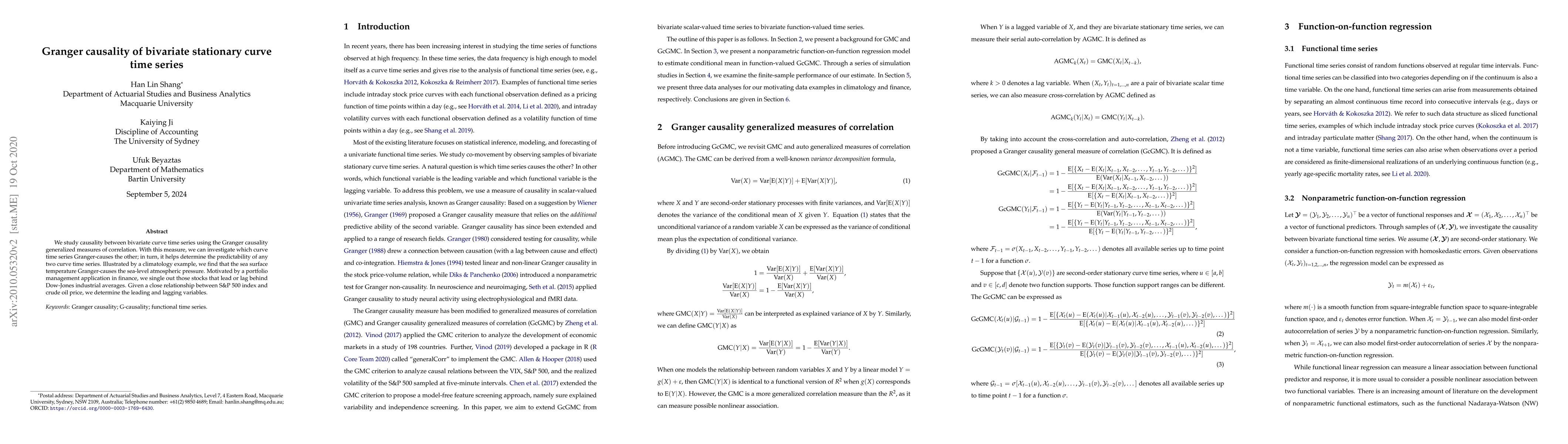 This paper explores Granger causality between bivariate stationary curve time series using generalized measures of correlation. It identifies the sea surface temperature as Granger-causing sea-level atmospheric pressure and highlights the leading and lagging stocks relative to the Dow-Jones industrial averages in finance.