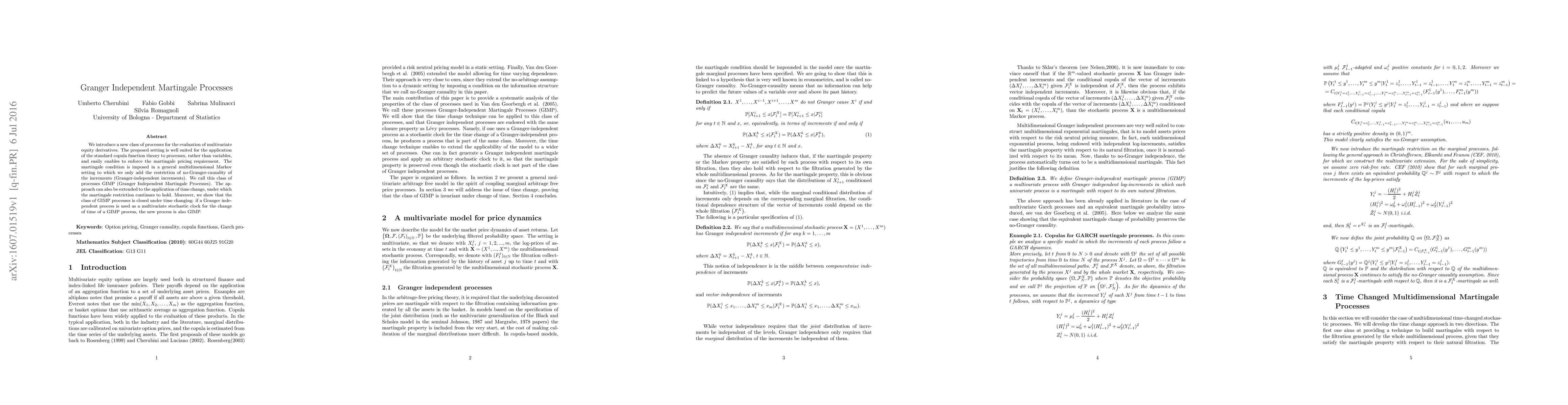 We introduce a new class of processes for the evaluation of multivariate equity derivatives. The proposed setting is well suited for the application of the standard copula function theory to processes, rather than variables, and easily enables to enforce the martingale pricing requirement. The martingale condition is imposed in a general multidimensional Markov setting to which we only add the restriction of no-Granger-causality of the increments (Granger-independent increments). We call this class of processes GIMP (Granger Independent Martingale Processes). The approach can also be extended to the application of time change, under which the martingale restriction continues to hold. Moreover, we show that the class of GIMP processes is closed under time changing: if a Granger independent process is used as a multivariate stochastic clock for the change of time of a GIMP process, the new process is also GIMP.