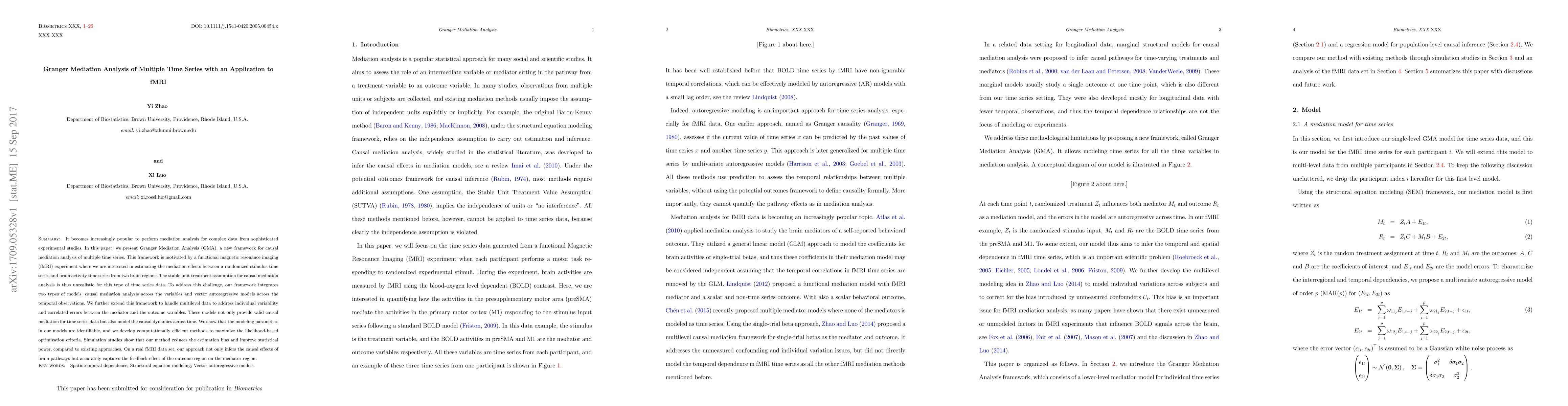 This paper introduces Granger Mediation Analysis (GMA), a novel framework for causal mediation analysis in multiple time series data, particularly suited for fMRI experiments. The proposed method integrates causal mediation analysis with vector autoregressive models to handle temporal dynamics and individual variability, demonstrating improved estimation accuracy and statistical power through simulations and real fMRI data analysis.