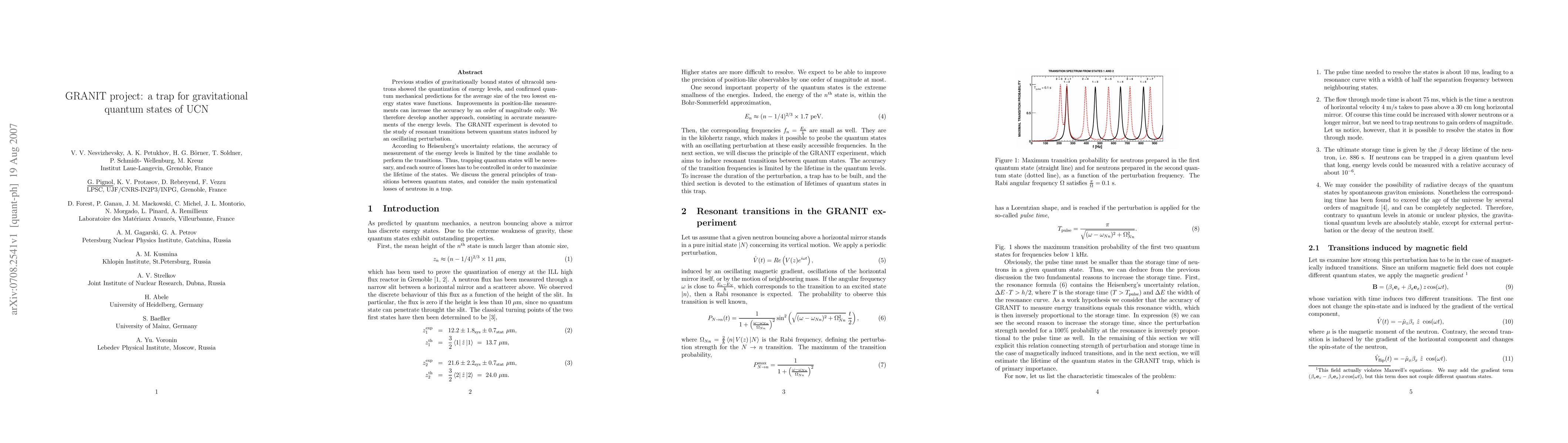 The GRANIT project aims to study gravitational quantum states of ultracold neutrons (UCN) through precise energy level measurements, focusing on resonant transitions induced by oscillating perturbations. The experiment seeks to maximize the lifetime of trapped quantum states to overcome the limitations imposed by Heisenberg's uncertainty principle on measurement accuracy.