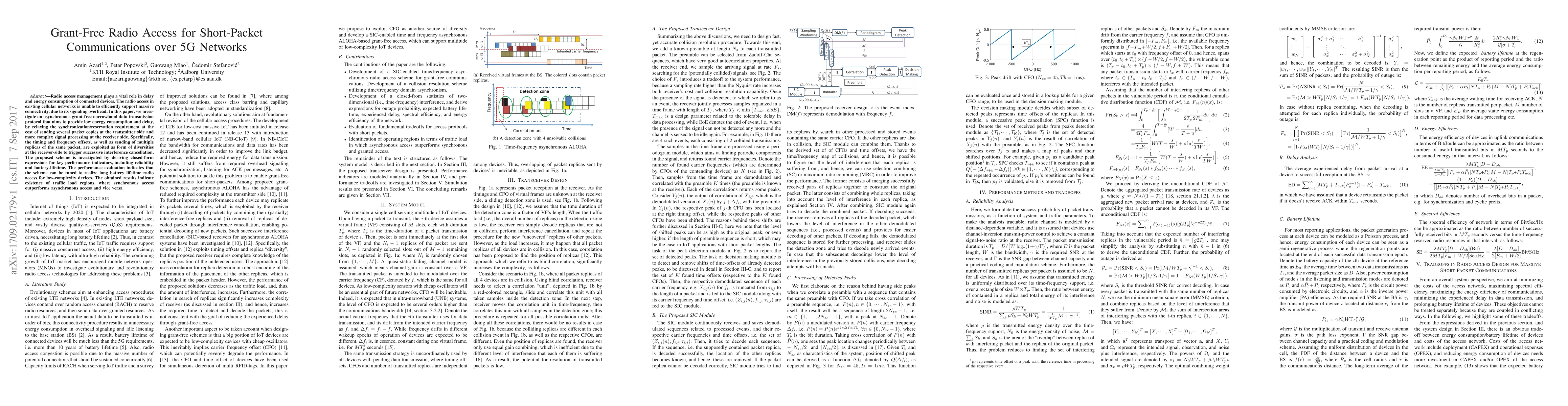 Radio access management plays a vital role in delay and energy consumption of connected devices. The radio access in existing cellular networks is unable to efficiently support massive connectivity, due to its signaling overhead. In this paper, we investigate an asynchronous grant-free narrowband data transmission protocol that aims to provide low energy consumption and delay, by relaxing the synchronization/reservation requirement at the cost of sending several packet copies at the transmitter side and more complex signal processing at the receiver side. Specifically, the timing and frequency offsets, as well as sending of multiple replicas of the same packet, are exploited as form of diversities at the receiver-side to trigger successive interference cancellation. The proposed scheme is investigated by deriving closed-form expressions for key performance indicators, including reliability and battery-lifetime. The performance evaluation indicates that the scheme can be tuned to realize long battery lifetime radio access for low-complexity devices. The obtained results indicate existence of traffic load regions, where synchronous access outperforms asynchronous access and vice versa.