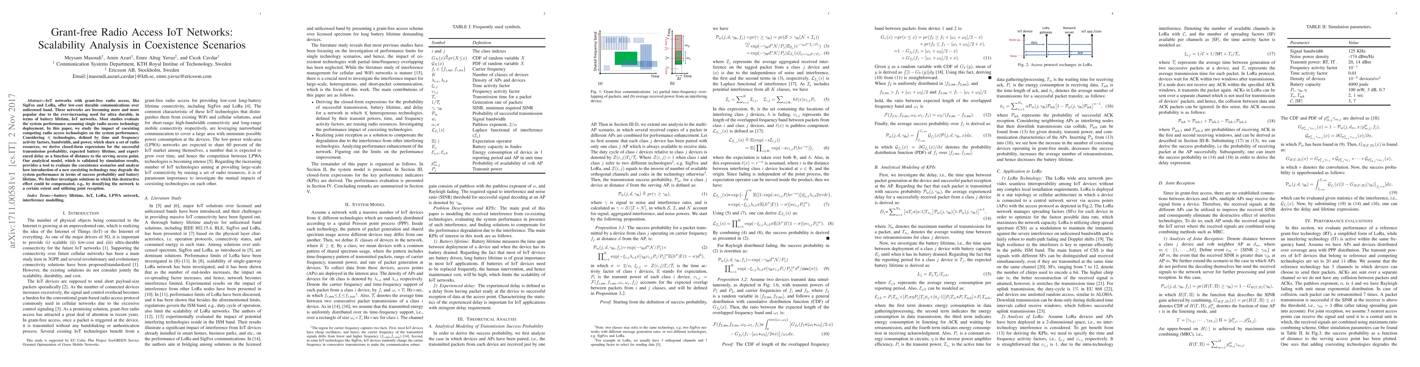 This paper analyzes the scalability of grant-free radio access IoT networks in coexistence scenarios, deriving expressions for successful transmission probability, expected battery lifetime, and delay. It evaluates how the introduction of multiple competing technologies impacts system performance and explores solutions like network densification and joint reception to mitigate degradation.