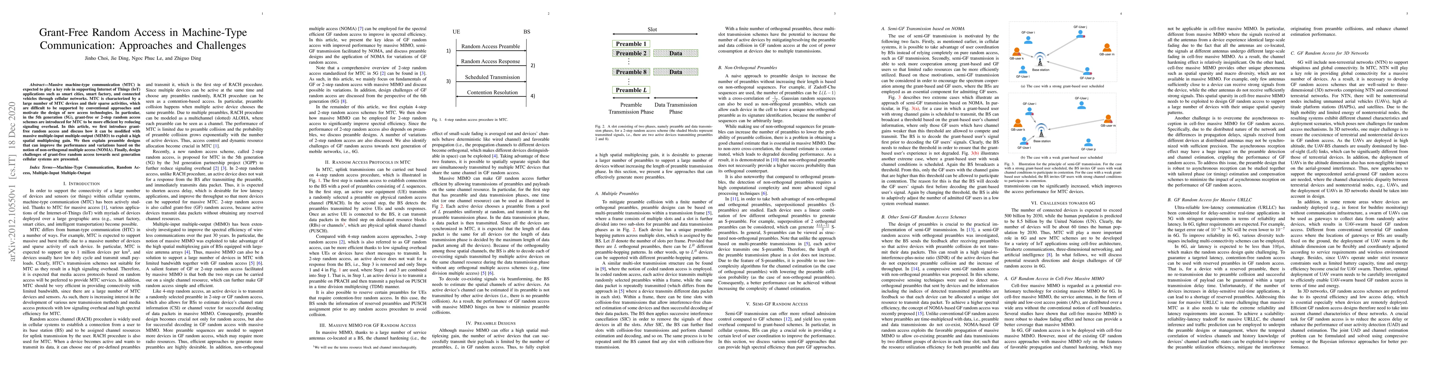 Massive machine-type communication (MTC) is expected to play a key role in supporting Internet of Things (IoT) applications such as smart cities, smart factory, and connected vehicles through cellular networks. MTC is characterized by a large number of MTC devices and their sparse activities, which are difficult to be supported by conventional approaches and motivate the design of new access technologies. In particular, in the 5th generation (5G), grant-free or 2-step random access schemes are introduced for MTC to be more efficient by reducing signaling overhead. In this article, we first introduce grant-free random access and discuss how it can be modified with massive multiple-input multiple-output (MIMO) to exploit a high spatial multiplexing gain. We then explain preamble designs that can improve the performance and variations based on the notion of non-orthogonal multiple access (NOMA). Finally, design challenges of grant-free random access towards next generation cellular systems are presented.