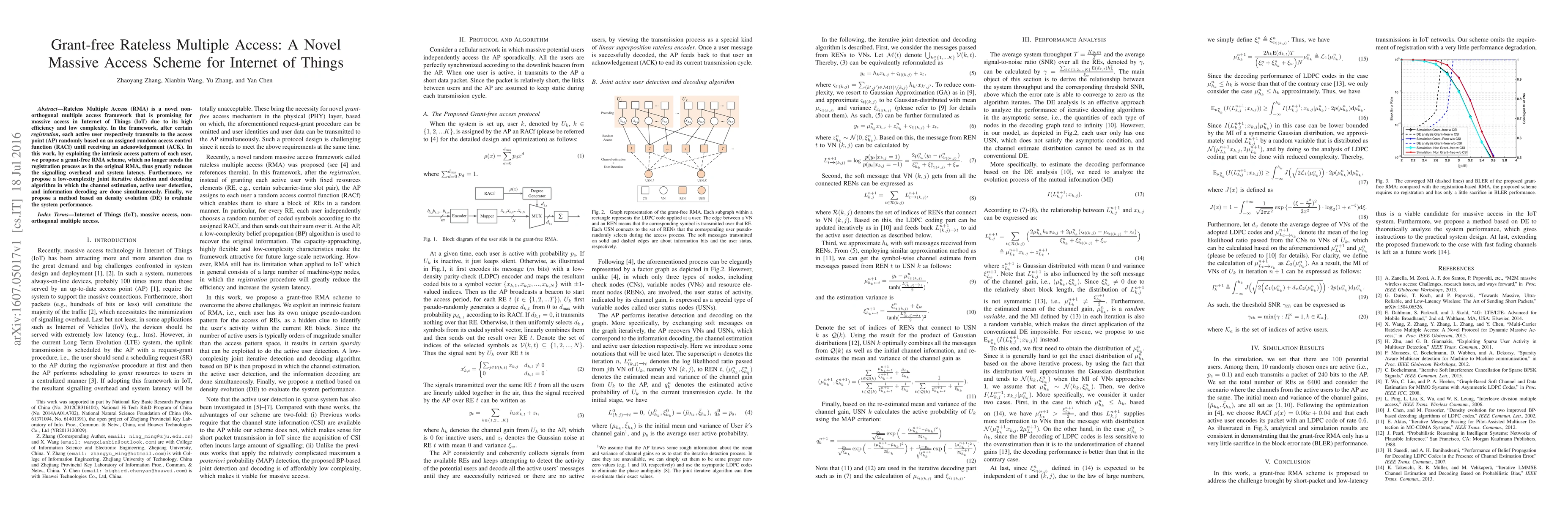This paper proposes a grant-free Rateless Multiple Access (RMA) scheme for massive Internet of Things (IoT) access, eliminating the registration process to reduce overhead and latency. It introduces a low-complexity joint iterative detection and decoding algorithm for simultaneous channel estimation, active user detection, and information decoding.