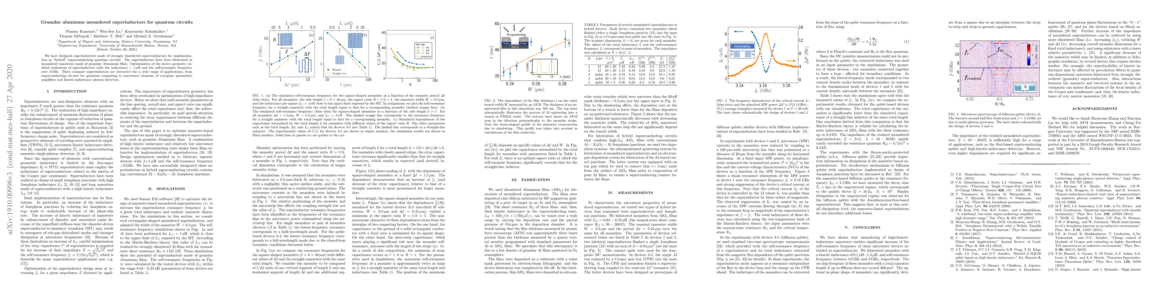 The paper presents a novel design and fabrication method for granular aluminum meandered superinductors with high self-resonance frequencies, suitable for hybrid superconducting quantum circuits.