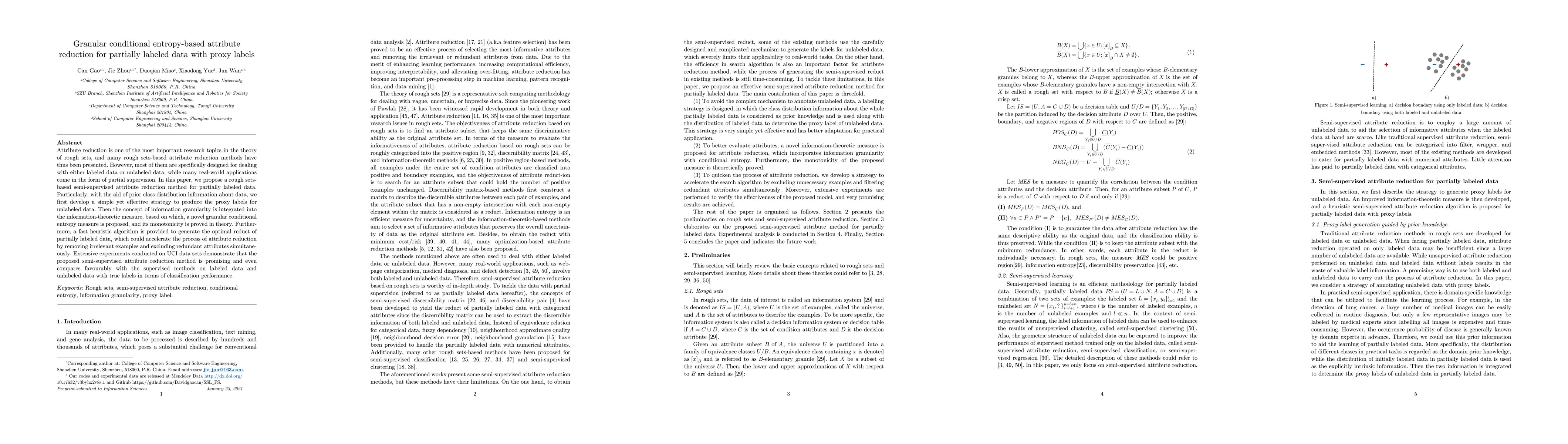 This paper introduces a novel rough sets-based semi-supervised attribute reduction method for partially labeled data, using granular conditional entropy and proxy labels to improve classification performance, and demonstrates its effectiveness through experiments on UCI datasets.