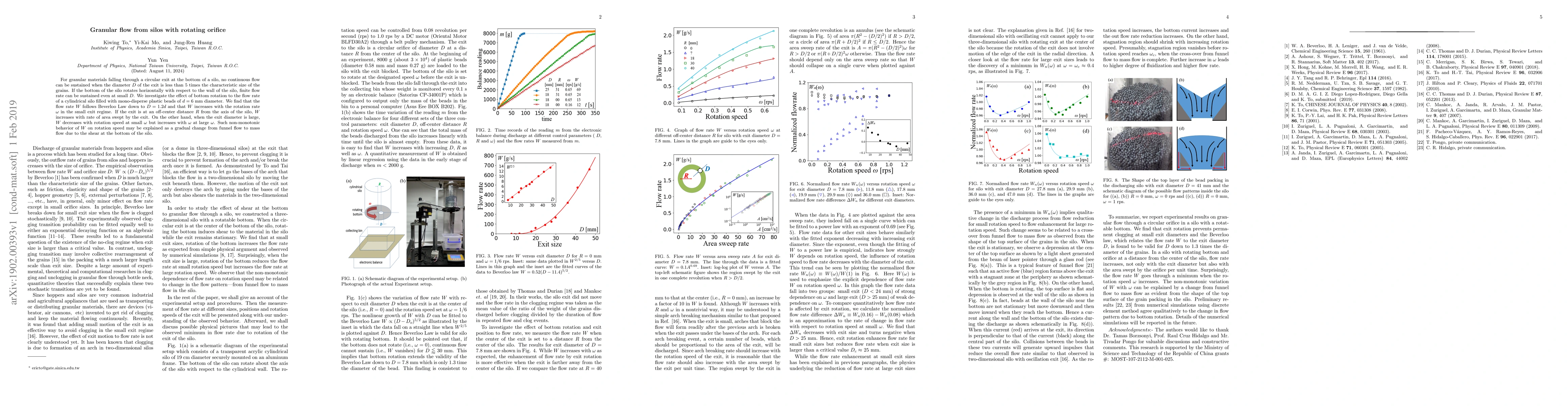 This study investigates granular flow through a rotating silo orifice, finding that rotation can sustain flow even when the exit diameter is less than five times the grain size. The flow rate increases with rotation speed, especially in small exit regimes, and exhibits non-monotonic behavior influenced by the transition from funnel flow to mass flow due to bottom shear.