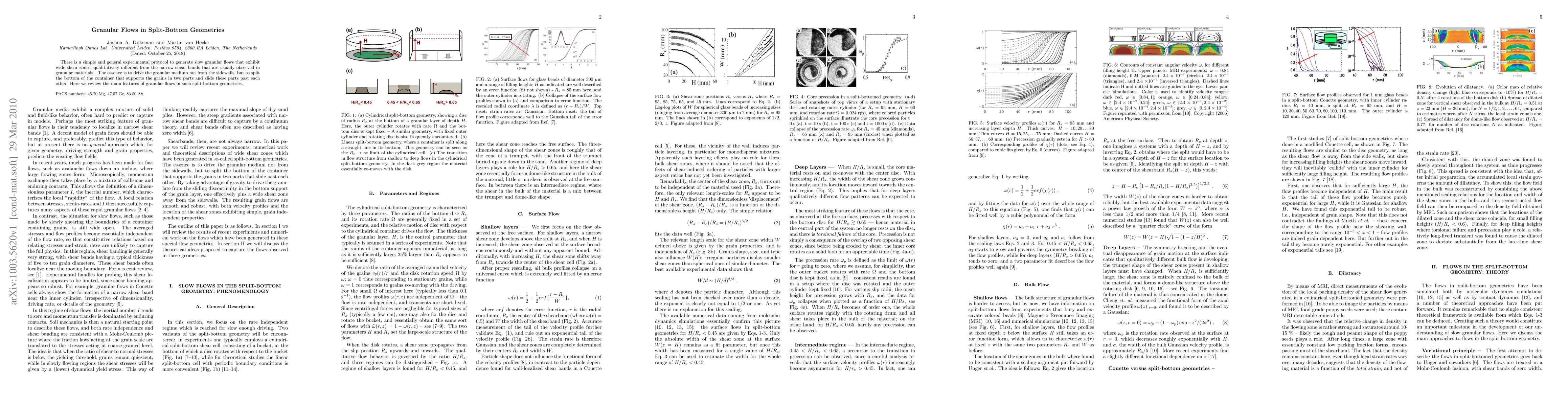 This study presents an experimental method to generate slow granular flows with wide shear zones by sliding split bottoms of a container, differing from typical narrow shear bands. The paper reviews key characteristics of these granular flows in split-bottom geometries.