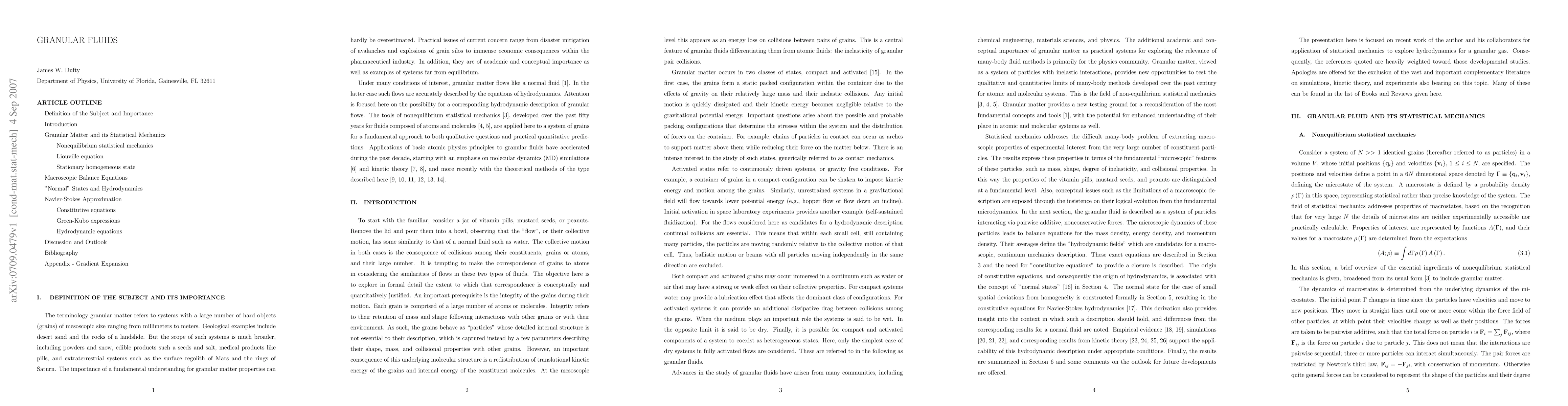 The paper presents a statistical mechanical framework for deriving hydrodynamic equations for granular fluids, including the formulation of constitutive equations and expressions for transport coefficients, extending the applicability of hydrodynamics to granular systems.
