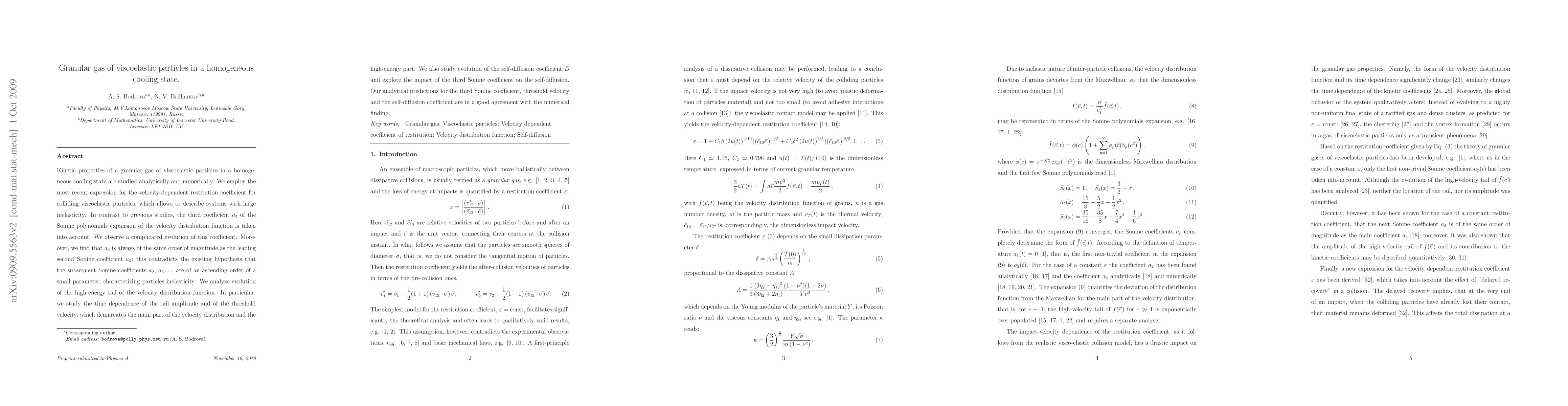 Kinetic properties of a granular gas of viscoelastic particles in a homogeneous cooling state are studied analytically and numerically. We employ the most recent expression for the velocity-dependent restitution coefficient for colliding viscoelastic particles, which allows to describe systems with large inelasticity. In contrast to previous studies, the third coefficient a3 of the Sonine polynomials expansion of the velocity distribution function is taken into account. We observe a complicated evolution of this coefficient. Moreover, we find that a3 is always of the same order of magnitude as the leading second Sonine coefficient a2; this contradicts the existing hypothesis that the subsequent Sonine coefficients a2, a3 ..., are of an ascending order of a small parameter, characterizing particles inelasticity. We analyze evolution of the high-energy tail of the velocity distribution function. In particular, we study the time dependence of the tail amplitude and of the threshold velocity, which demarcates the main part of the velocity distribution and the high-energy part. We also study evolution of the self-diffusion coefficient D and explore the impact of the third Sonine coefficient on the self-diffusion. Our analytical predictions for the third Sonine coefficient, threshold velocity and the self-diffusion coefficient are in a good agreement with the numerical finding.