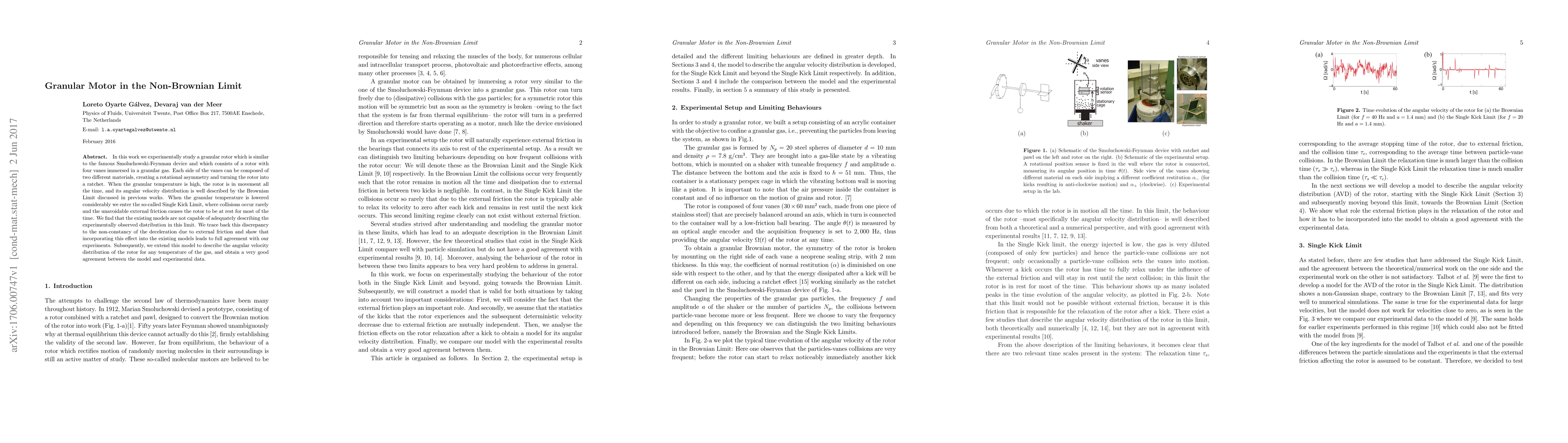 In this work we experimentally study a granular rotor which is similar to the famous Smoluchowski-Feynman device and which consists of a rotor with four vanes immersed in a granular gas. Each side of the vanes can be composed of two different materials, creating a rotational asymmetry and turning the rotor into a ratchet. When the granular temperature is high, the rotor is in movement all the time, and its angular velocity distribution is well described by the Brownian Limit discussed in previous works. When the granular temperature is lowered considerably we enter the so-called Single Kick Limit, where collisions occur rarely and the unavoidable external friction causes the rotor to be at rest for most of the time. We find that the existing models are not capable of adequately describing the experimentally observed distribution in this limit. We trace back this discrepancy to the non-constancy of the deceleration due to external friction and show that incorporating this effect into the existing models leads to full agreement with our experiments. Subsequently, we extend this model to describe the angular velocity distribution of the rotor for any temperature of the gas, and obtain a very good agreement between the model and experimental data.