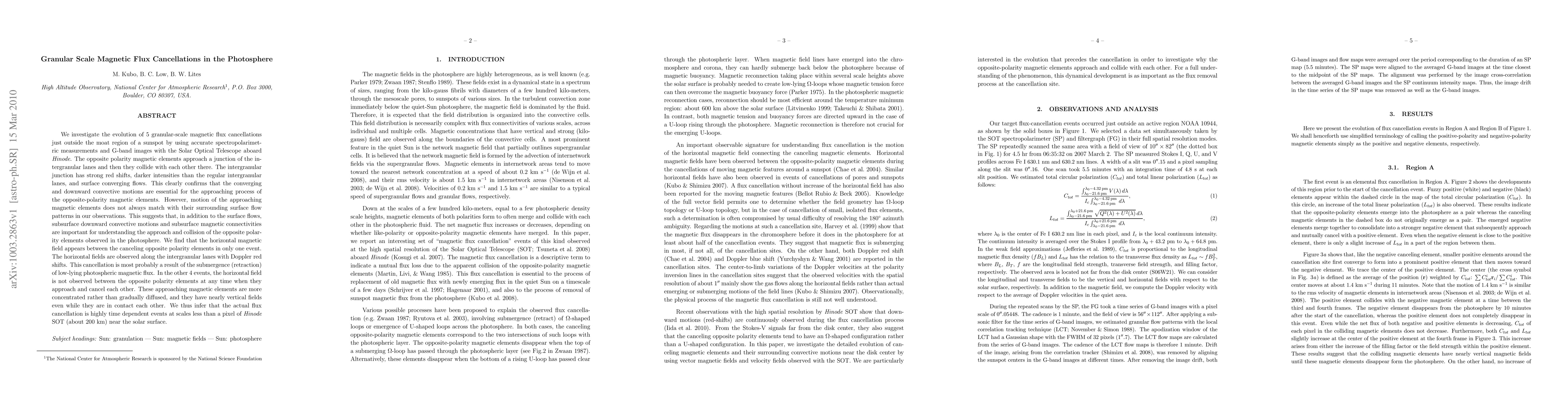 This paper examines granular-scale magnetic flux cancellations near sunspots using Hinode observations, finding that the approach and collision of opposite-polarity magnetic elements are driven by both surface and subsurface flows. The study highlights that flux cancellation is a time-dependent process occurring at scales smaller than 200 km, with horizontal magnetic fields appearing only in one event.