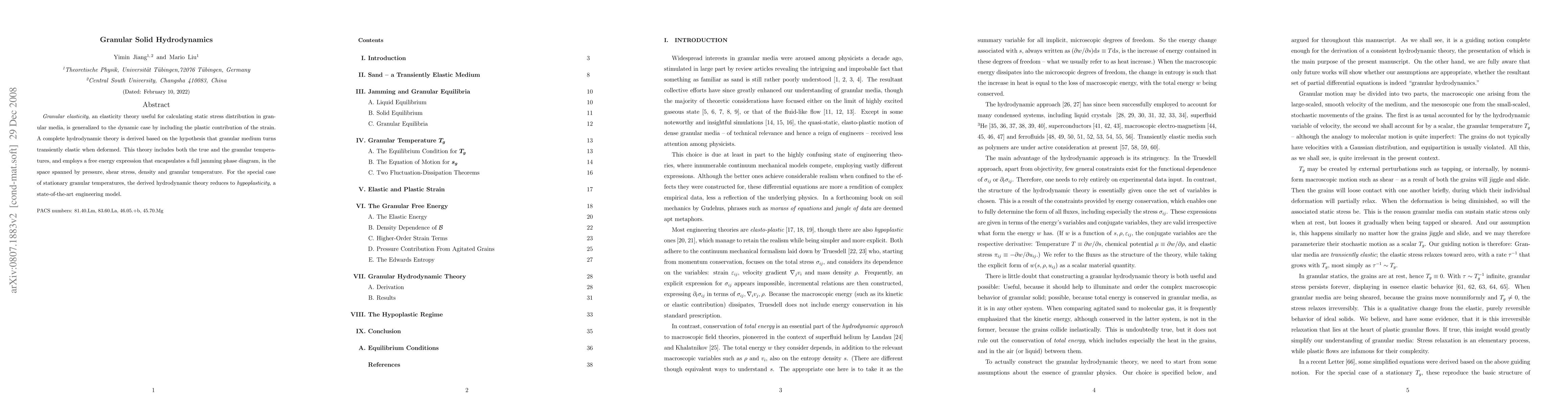 This paper generalizes granular elasticity to dynamic conditions, deriving a complete hydrodynamic theory that accounts for plastic strain and transient elasticity in granular media, encompassing a full jamming phase diagram and reducing to hypoplasticity under stationary granular temperatures.