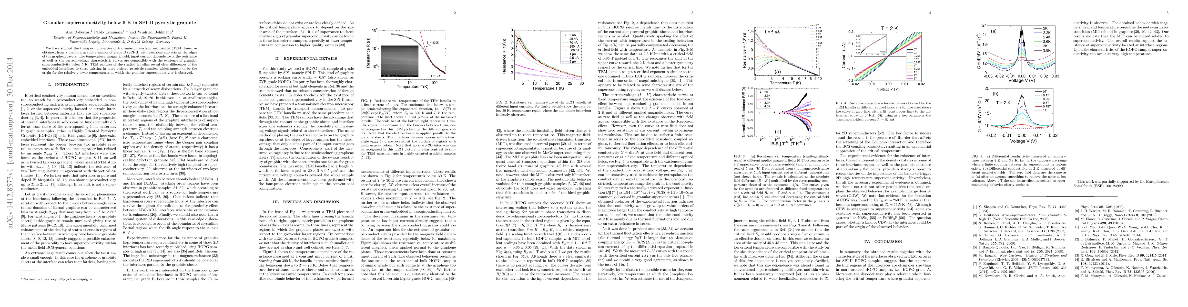 This study reveals granular superconductivity in SPI-II pyrolytic graphite below 5 K, evidenced by transport properties and current-voltage characteristics. The unique interfaces in the TEM lamellae, differing from more ordered samples, likely contribute to the lower superconducting transition temperature.