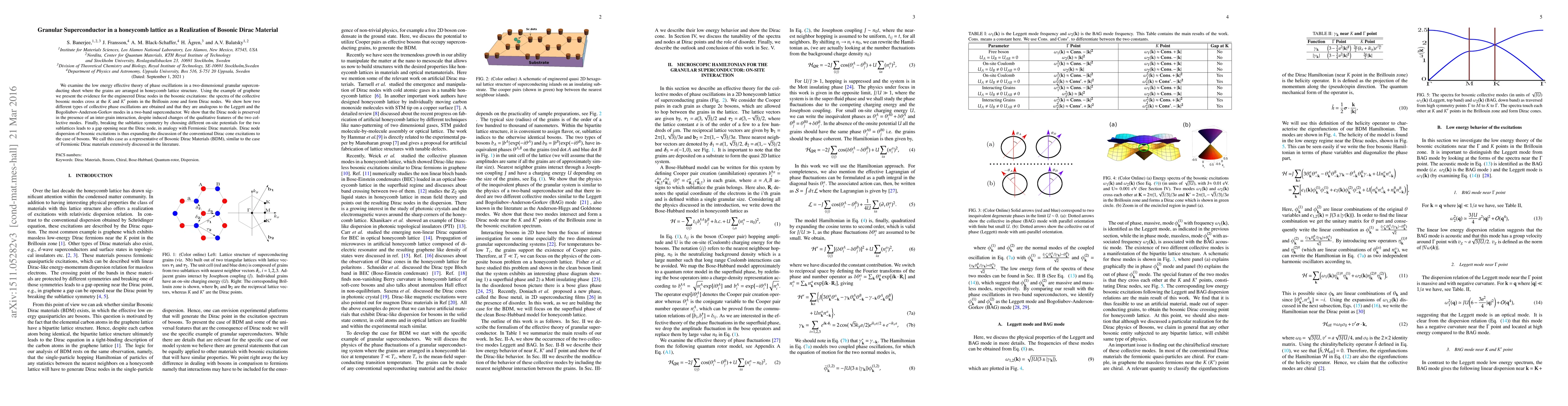 We examine the low energy effective theory of phase oscillations in a two-dimensional granular superconducting sheet where the grains are arranged in honeycomb lattice structure. Using the example of graphene we present the evidence for the engineered Dirac nodes in the bosonic excitations: the spectra of the collective bosonic modes cross at the K and K points in the Brillouin zone and form Dirac nodes. We show how two different types of collective phase oscillations are obtained and that they are analogous to the Leggett and the Bogoliubov-Anderson-Gorkov modes in a two-band superconductor. We show that the Dirac node is preserved in the presence of an inter-grain interaction, despite induced changes of the qualitative features of the two collective modes. Finally, breaking the sublattice symmetry by choosing different on-site potentials for the two sublattices leads to a gap opening near the Dirac node, in analogy with Fermionic Dirac materials. Dirac node dispersion of bosonic excitations is thus expanding the discussion of the conventional Dirac cone excitations to the case of bosons. We call this case as a representative of Bosonic Dirac Materials (BDM), similar to the case of Fermionic Dirac materials extensively discussed in the literature.
