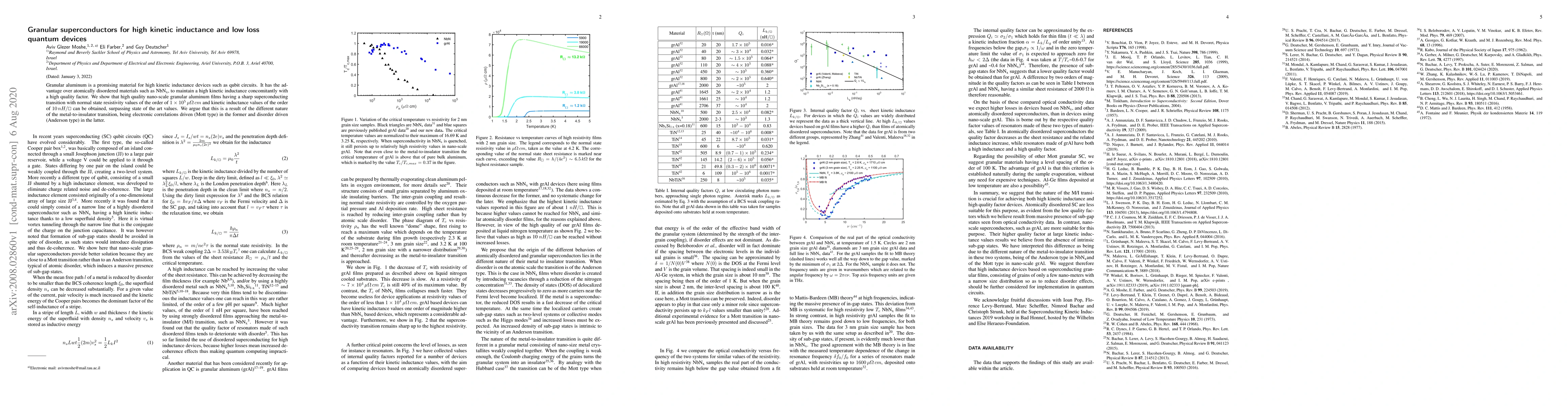 This paper demonstrates that granular aluminum films exhibit superior high kinetic inductance and low loss characteristics for quantum devices compared to atomically disordered materials like NbN_x, due to their electronic correlations-driven metal-to-insulator transition. The achieved films show a sharp superconducting transition, high quality factor, and state-of-the-art kinetic inductance values.