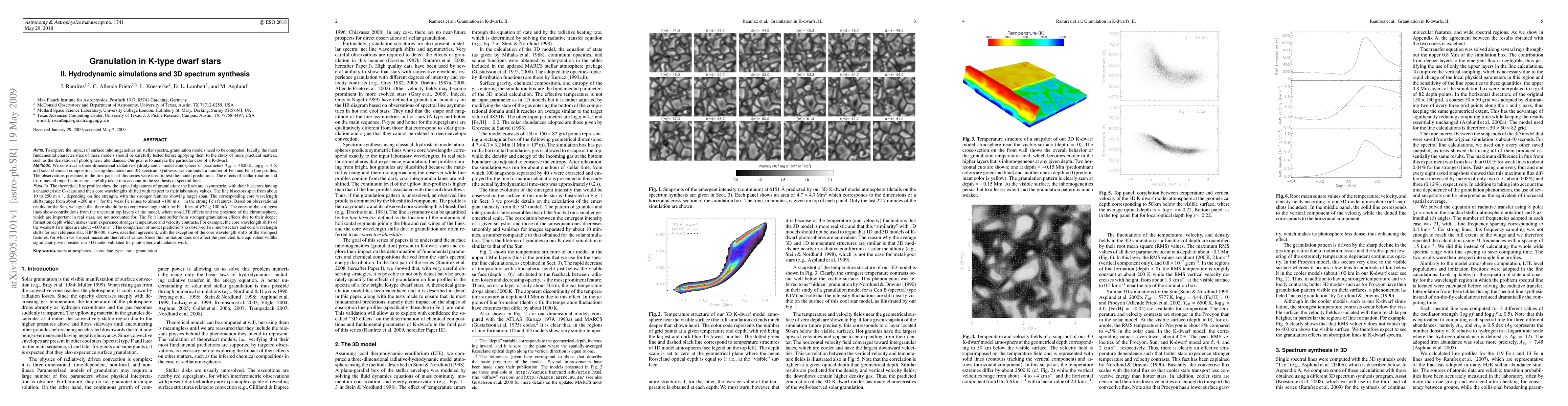 We construct a 3D radiative-hydrodynamic model atmosphere of parameters Teff = 4820 K, log g = 4.5, and solar chemical composition. The theoretical line profiles computed with this model are asymmetric, with their bisectors having a characteristic C-shape and their core wavelengths shifted with respect to their laboratory values. The line bisectors span from about 10 to 250 m/s, depending on line strength, with the stronger features showing larger span. The corresponding core wavelength shifts range from about -200 m/s for the weak Fe I lines to almost +100 m/s in the strong Fe I features. Based on observational results for the Sun, we argue that there should be no core wavelength shift for Fe I lines of EW > 100 mA. The cores of the strongest lines show contributions from the uncertain top layers of the model, where non-LTE effects and the presence of the chromosphere, which are important in real stars, are not accounted for. The comparison of model predictions to observed Fe I line bisectors and core wavelength shifts for a reference star, HIP86400, shows excellent agreement, with the exception of the core wavelength shifts of the strongest features, for which we suspect inaccurate theoretical values. Since this limitation does not affect the predicted line equivalent widths significantly, we consider our 3D model validated for photospheric abundance work.