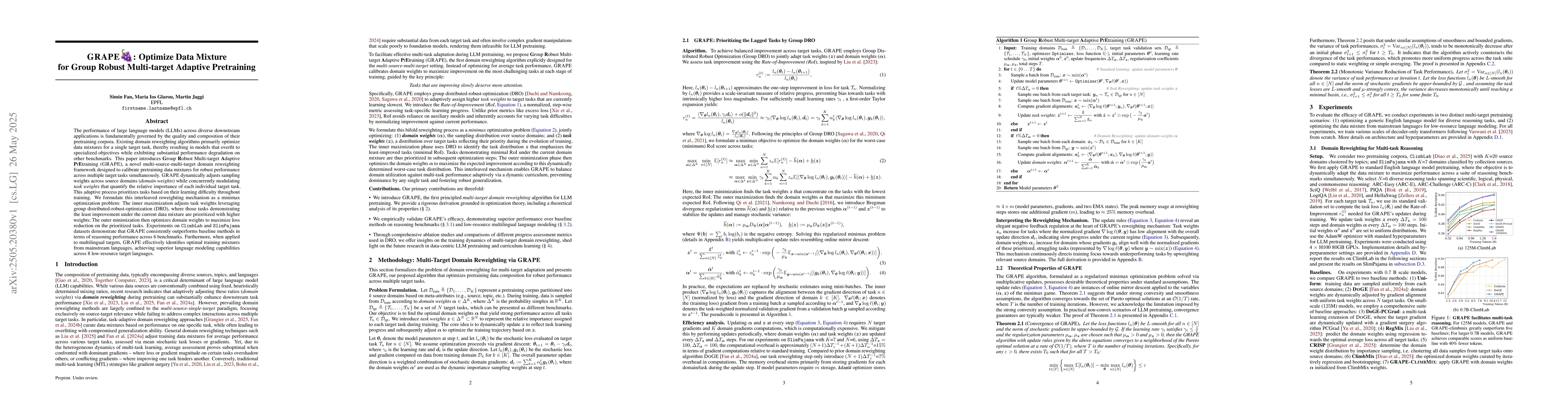 GRAPE optimizes pretraining data mixtures for multiple target tasks, outperforming baseline methods in reasoning performance across 6 benchmarks and achieving superior language modeling capabilities on low-resource target languages.