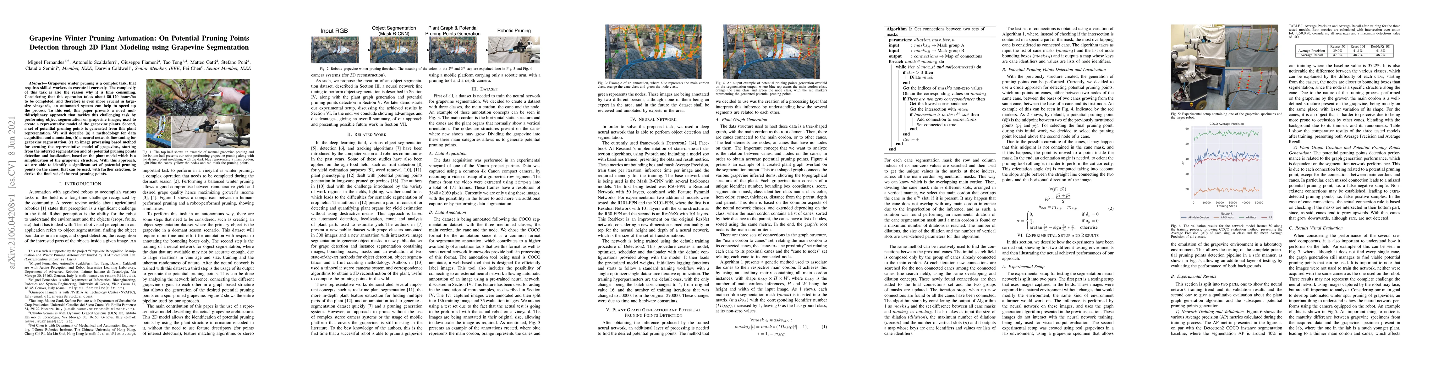 Grapevine winter pruning is a complex task, that requires skilled workers to execute it correctly. The complexity of this task is also the reason why it is time consuming. Considering that this operation takes about 80-120 hours/ha to be completed, and therefore is even more crucial in large-size vineyards, an automated system can help to speed up the process. To this end, this paper presents a novel multidisciplinary approach that tackles this challenging task by performing object segmentation on grapevine images, used to create a representative model of the grapevine plants. Second, a set of potential pruning points is generated from this plant representation. We will describe (a) a methodology for data acquisition and annotation, (b) a neural network fine-tuning for grapevine segmentation, (c) an image processing based method for creating the representative model of grapevines, starting from the inferred segmentation and (d) potential pruning points detection and localization, based on the plant model which is a simplification of the grapevine structure. With this approach, we are able to identify a significant set of potential pruning points on the canes, that can be used, with further selection, to derive the final set of the real pruning points.